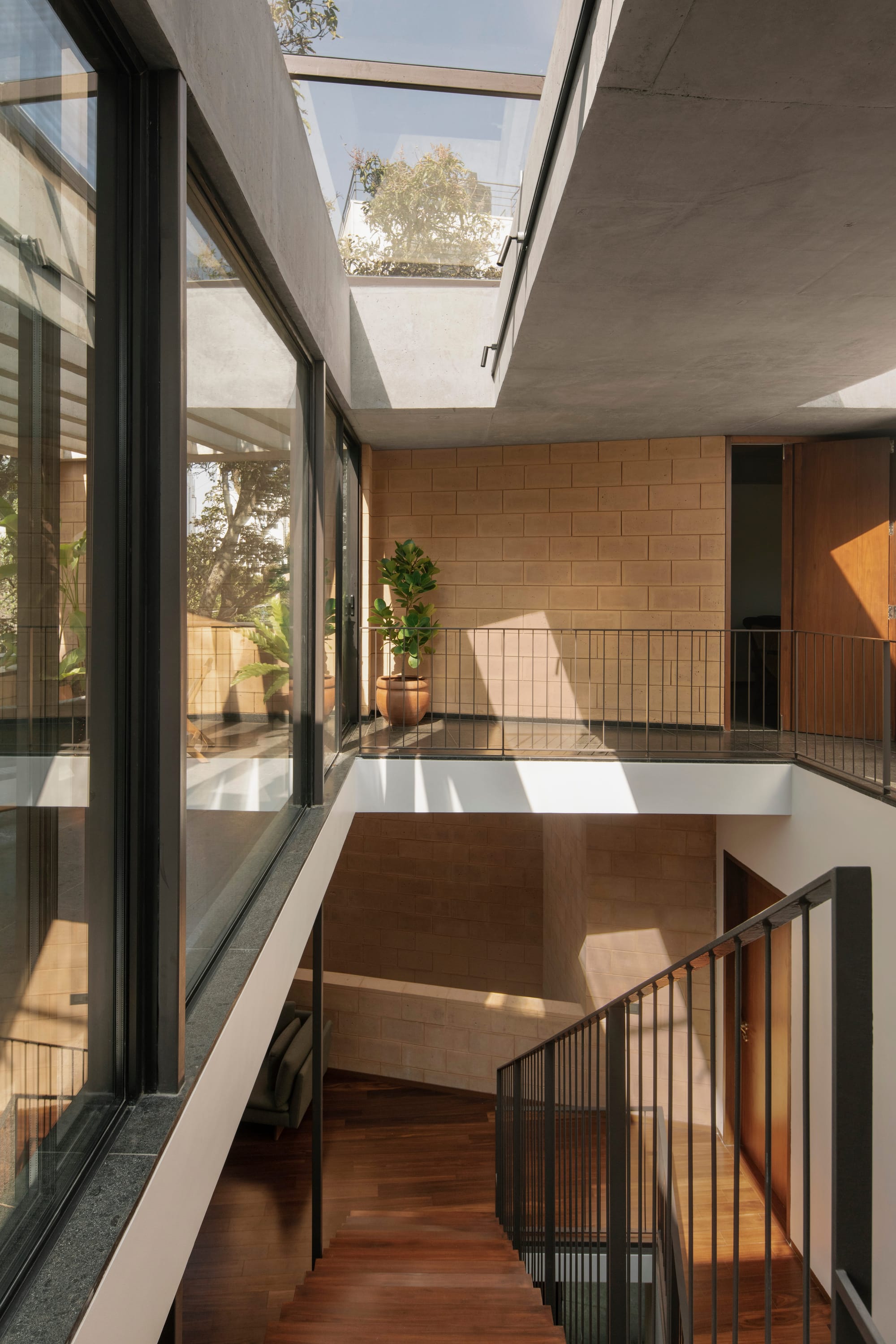 Inside, the home is organized around a dramatic central atrium that serves as both a physical and visual anchor for the family. At its core is a sculptural staircase, an architectural element that feels more like a piece of art than a functional necessity. Strategically placed skylights at multiple levels wash this central void with natural light, ensuring that even the deepest parts of the house feel airy and connected to the sky.