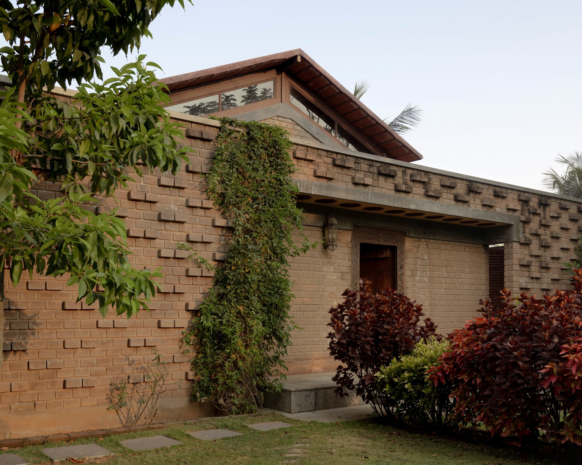 The site, an expanse of industrial land softened by an orchard of fruit and coconut trees, is flanked by a factory at its edge. The context is imbued in its very name: ‘Kaattu Veedu’ meaning a ‘house in the wild’, or in this context, ‘nestled in nature’. The client’s desire was modest: a quiet retreat where their father could escape the relentless pace of Bengaluru for an afternoon of rest. The tranquility envelops you even before you enter, by the very way the façade guides the light across its staggered blocks. Through this simple interplay, the wall is uplifted from a mundane flat surface into a stage for the dance of shadows throughout the day. As you walk closer, the gaze shifts to a monumental main entrance door, salvaged from a historical Athangudi house, richly steeped in tradition.