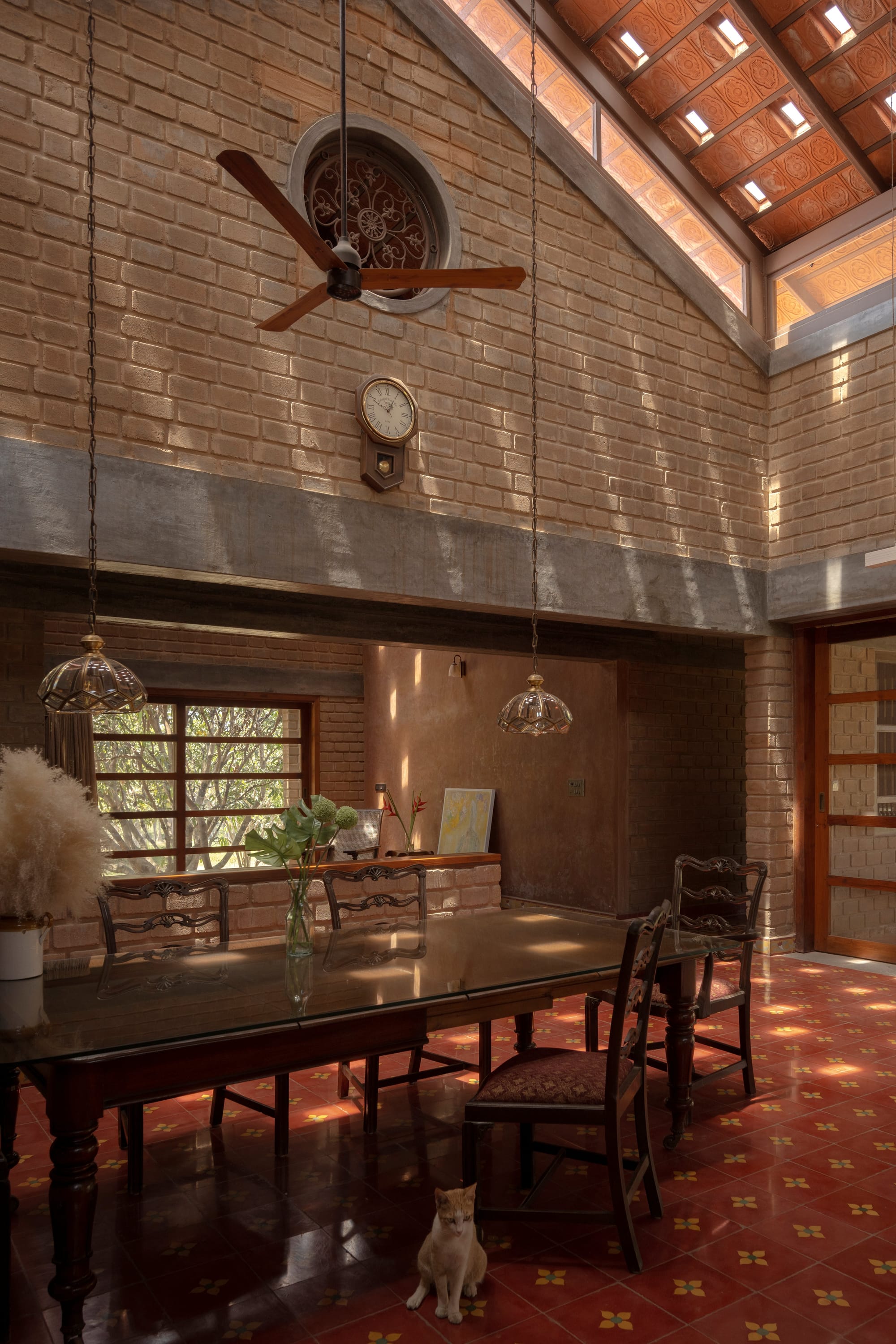 As the walls root the house in the Earth, the interiors root it in its culture. The floors are a tactile patchwork of handmade Athangudi tiles, Kota stone, and granite; each bearing its own local resonance. The verandahs are lined with wooden columns salvaged from Karaikudi homes, their patina posing as a witness to generations past. The Moroccan light fittings scatter patterned shadows across the interiors, adding yet another layer to the dance of light and time. The furniture transcends geography. A French Colonial dining table, shipped from South Africa, anchors the dining space, its global journey juxtaposed against the house’s local earthiness. A planter’s desk, positioned to conjure the image of a village courtyard, recalls the client’s desire for a home that felt “profoundly natural and intrinsically linked to its region,” and yet free from architectural cliché. Even the reclaimed wardrobes hold domestic memories.