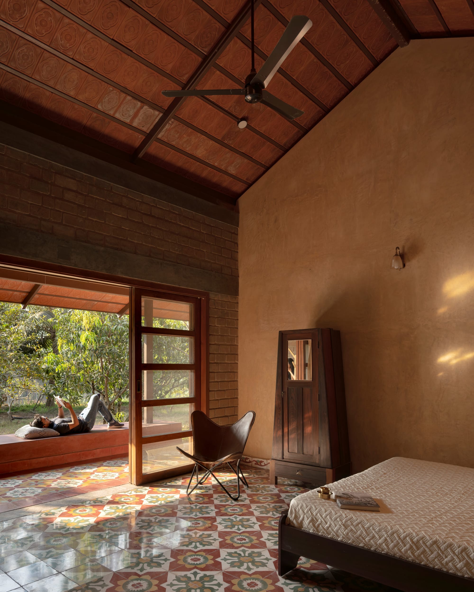 On the roof, double Mangalore tiles provide insulation from heat and allow the structure to breathe. Wherever a flat roof is required, terracotta pots are used as infills in slabs. This serves to reduce the quantity of concrete while adding a vital insulation layer. Together, these elements create a microclimate within the home–an ambience of comfort that reflects nature and tradition.
