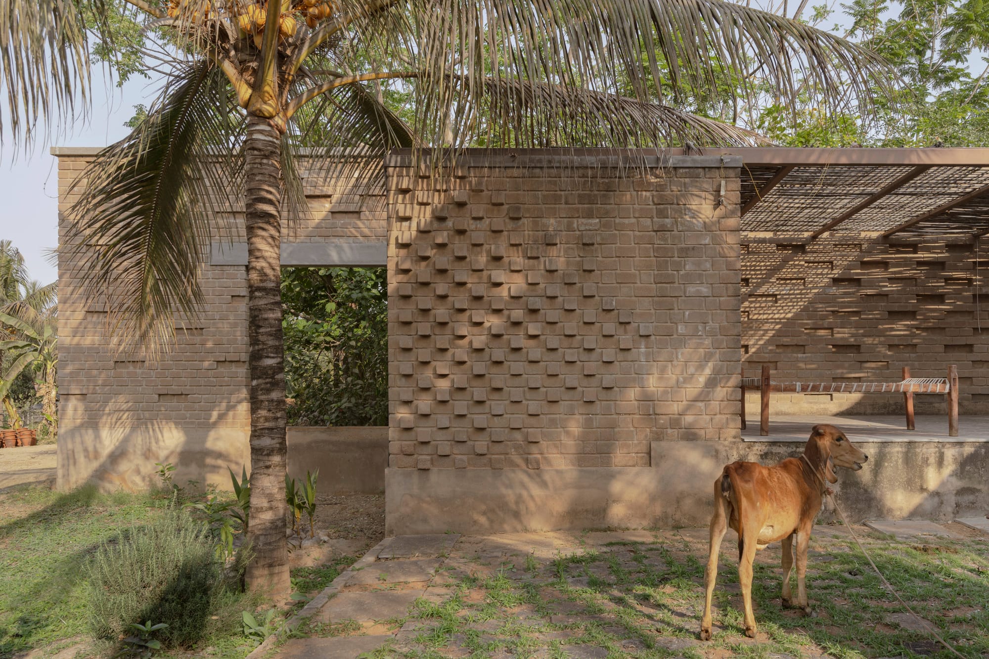 In Hosur’s warm climate, comfort is inseparable from nature. Kaattu Veedu demonstrates how vernacular wisdom can be reinterpreted through modern systems to achieve climatic intelligence. The CSEB walls regulate indoor temperatures by absorbing heat during the day and releasing it slowly at night. This is possible due to its inherently high “thermal mass”, the property of a material that defines how much heat it can absorb and store over time. Although mostly exposed, some select surfaces of the living spaces and bathrooms that requested a finished surface were bestowed with lime plaster. A “breathing” material, lime plaster contributes to making a space thermally comfortable, while also assisting with moisture regulation.