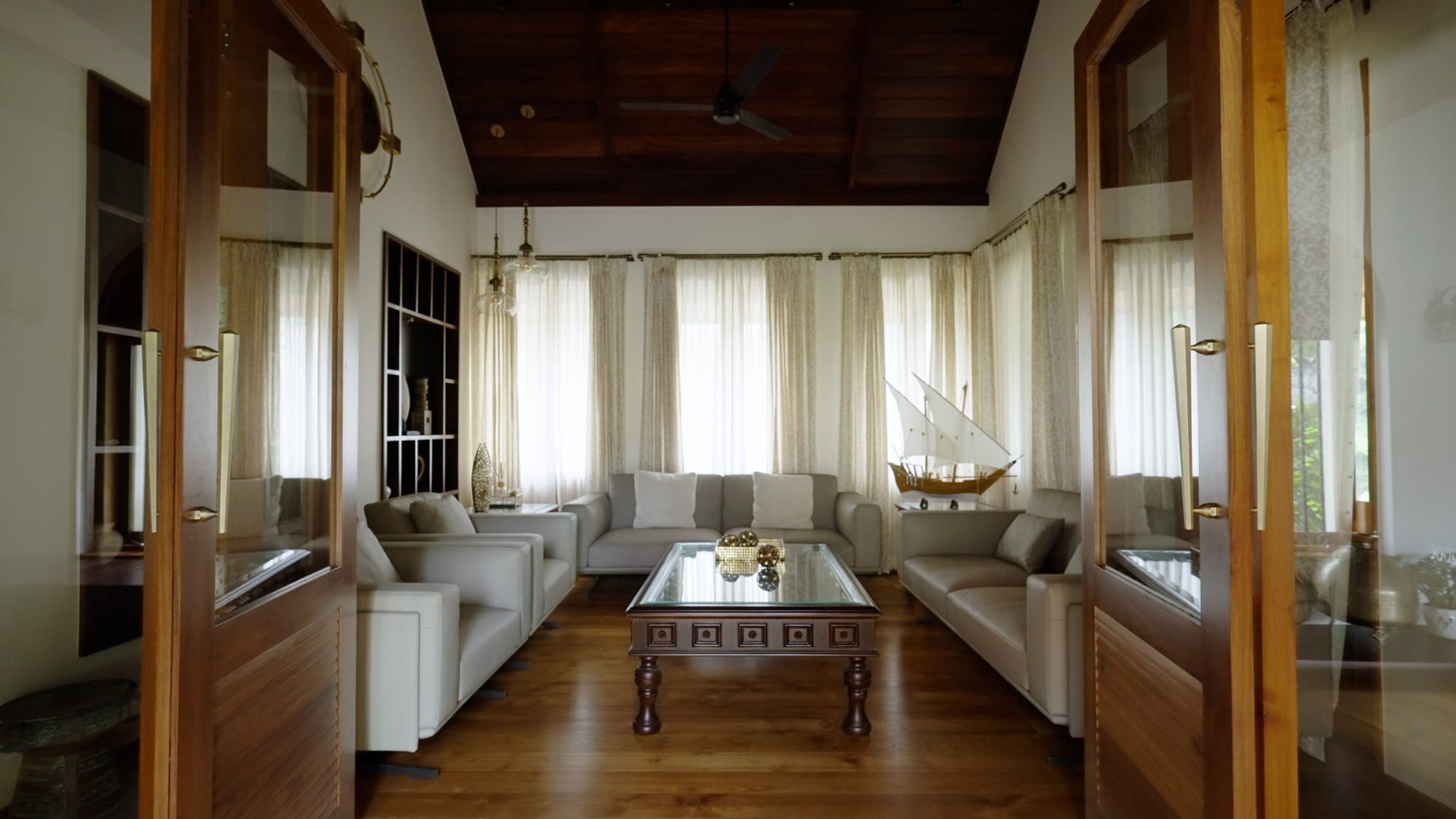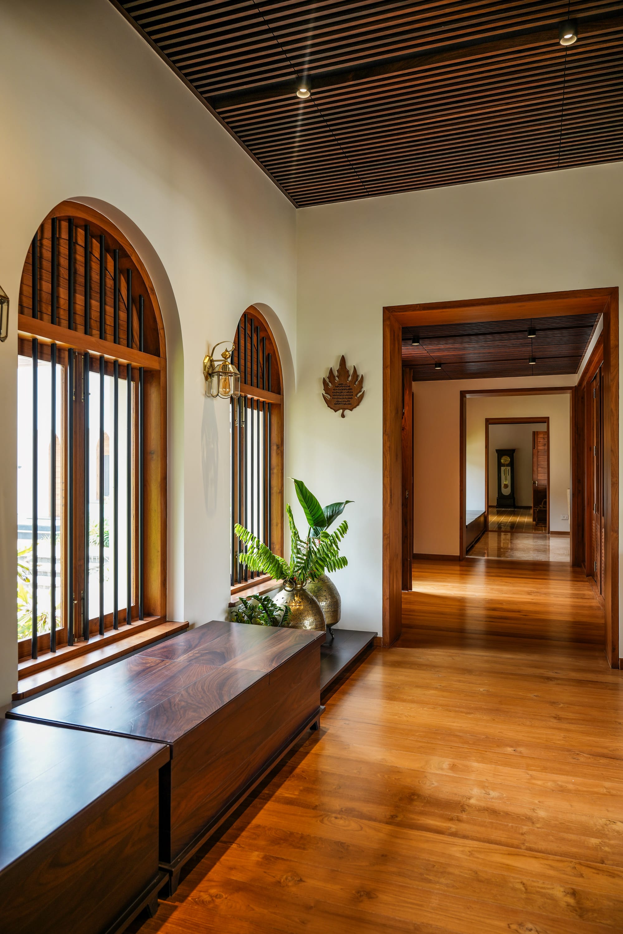 As one crosses the threshold, the formal living room reveals itself as a minimalistic, nouveau riche chamber designed for hosting in style. Elegant and understated, it is adorned with nautical-inspired accents, wooden detailing, and glass-blown lamps that carry the charisma of having seen the world, only to come home in the end. Corridors radiate outward from this room, drawing in convectional currents and light, and submerging the home in buoyant air pockets of cross-ventilated tranquility. Lined with arched windows in wooden frames, these corridors feature built-in benches carved into window nooks, inviting quiet pause and moments of sublime reflection.
