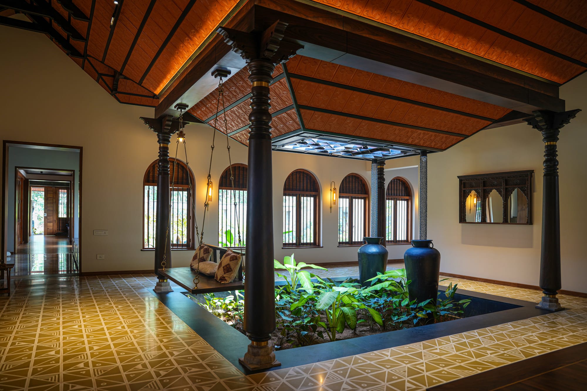 The central courtyard becomes the navel of the home, a twilight zone between public and private realities, just as Vāastu Śāstra recommends. The informal seating, open kitchen, and family spaces all pour organically into this inner sanctum. Four Chettinad columns with carved capitals emerge from the stone like sentinels. An heirloom swing hangs between them, creaking softly as it moves, the sound blending with the rustle of leaves and the occasional call of a koel.