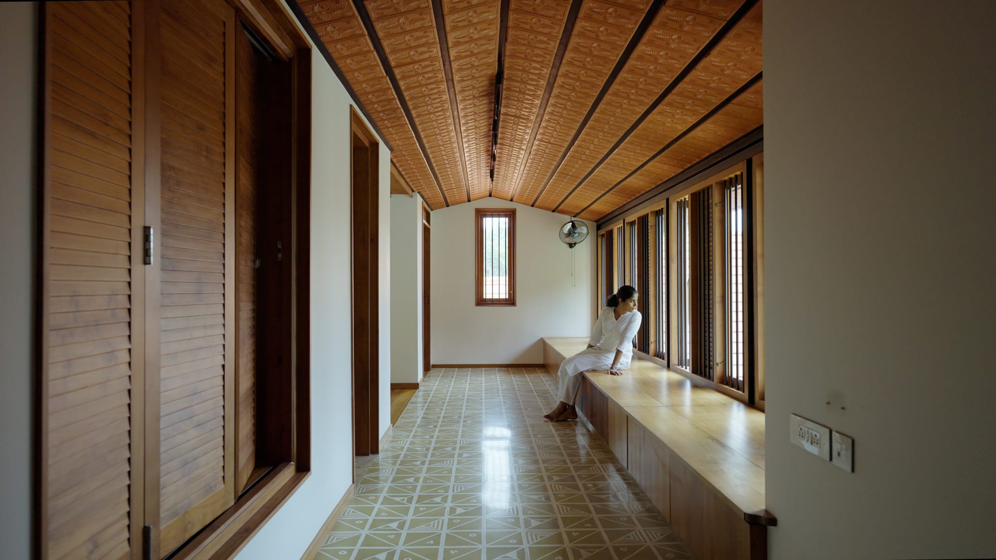 In congruence with bioclimatic design principles, the home carves recesses into the landscape through long granite walls that soften the divide between built and unbuilt spaces, beading together poignant liminal spaces in a mosaic of layered courtyards. The verandahs and 'Thinnai'-rooted porches, supported by opportunely recycled Chettinad wooden pillars, feature stone flooring, while the typical sloping roofs, clad in cement tiles, help the spatial volumes breathe.