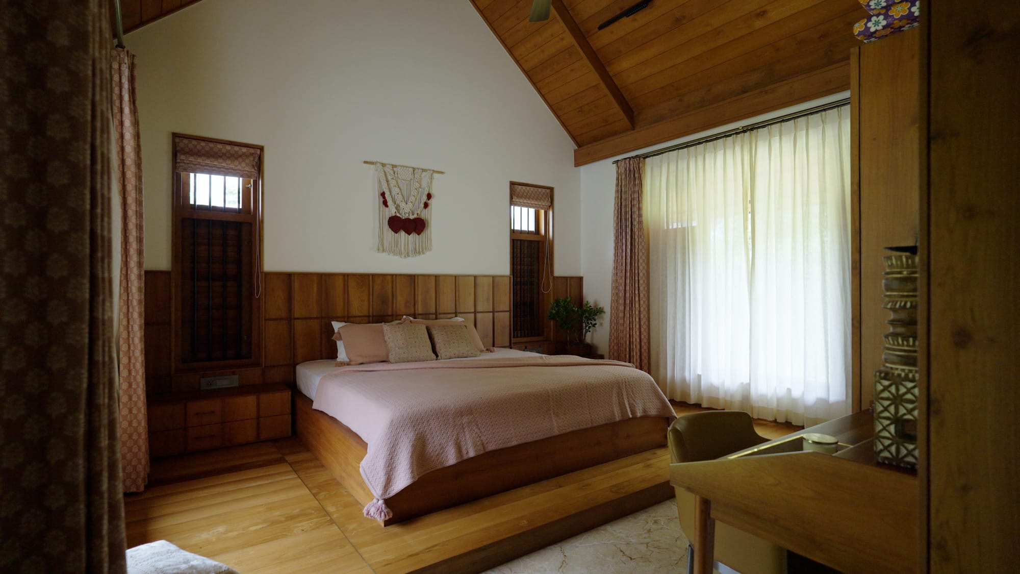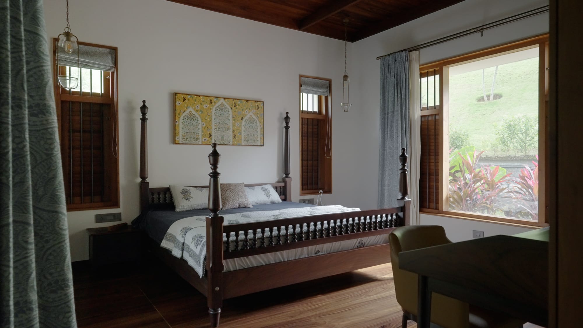 The master bedroom, located on the eastern end of the upper floor, welcomes the early light. A four-poster bed with lathe-turned posts grounds the room, while ornate wall art with floral arabesques offers a subtle nod to the bloom-laden trees just beyond the windows. Sculptural lighting fixtures cast an amber glow, recalling the old ‘Veedu’ mansions where oil lamps once flickered in tenebrous corners.