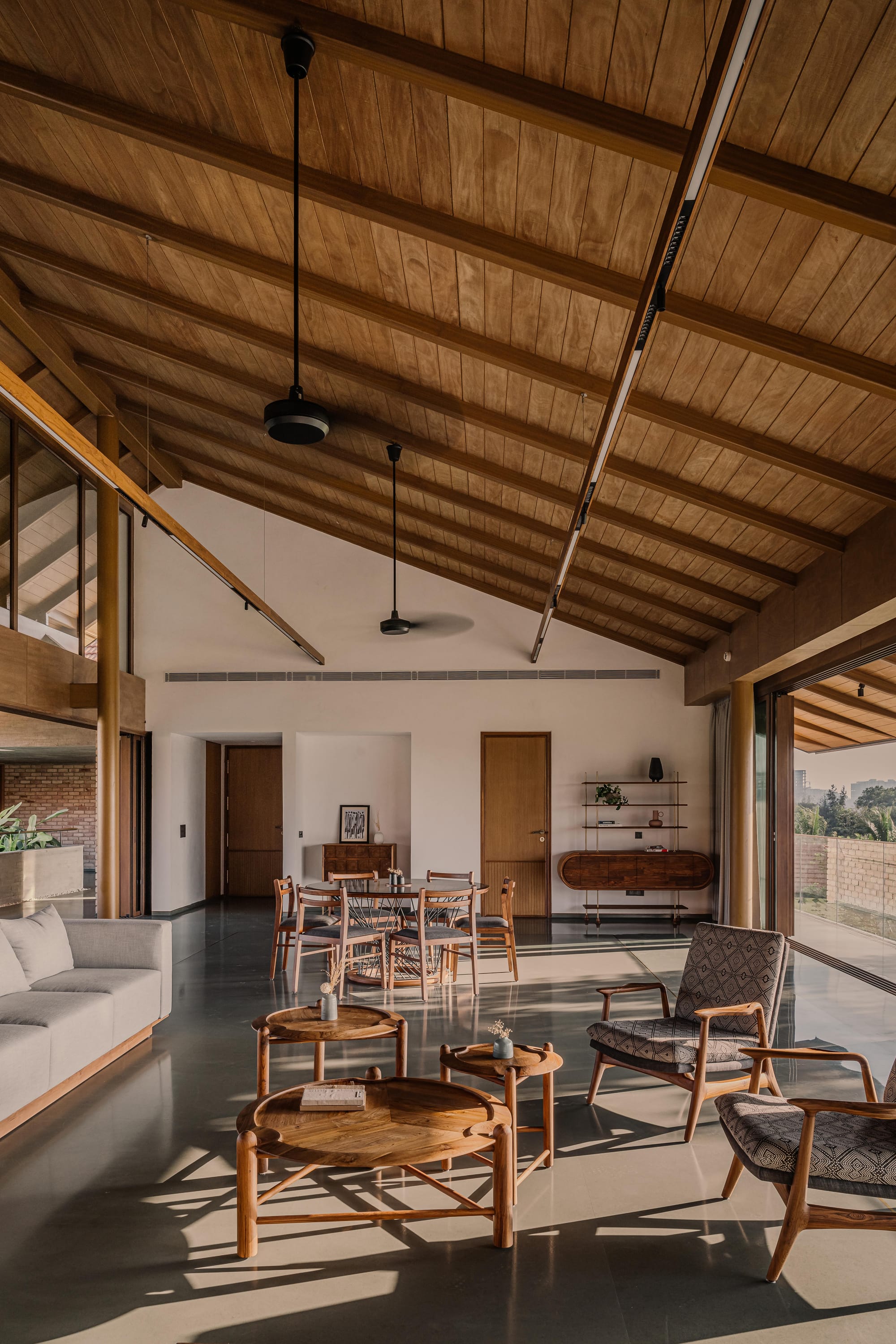 “In the living room, we have these large sliding glass doors that retract completely into the walls,” explains co-principal architect Chinmay Laiwala. “This allows the entire ground level to open seamlessly to its surroundings, without any visual or physical barriers.” Along the western edge of the verandah, a wooden trellis runs the length of the living and sports rooms, both of which overlook the panorama of the central courtyard.