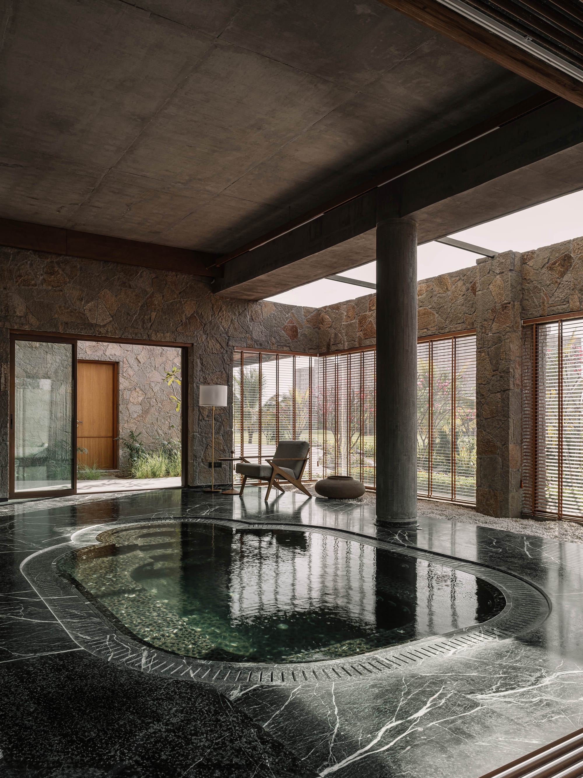 Tucked away in an unobtrusive corner of this Surat home lies a sunken jacuzzi — an oasis-like retreat illuminated by a skylight above that transforms the pool into a glacier-like jewel, glowing nascently even when the louvered blinds are drawn. Clad in polished green marble and stone, this discreet alcove evokes a rarefied expression of modern tropical luxury.