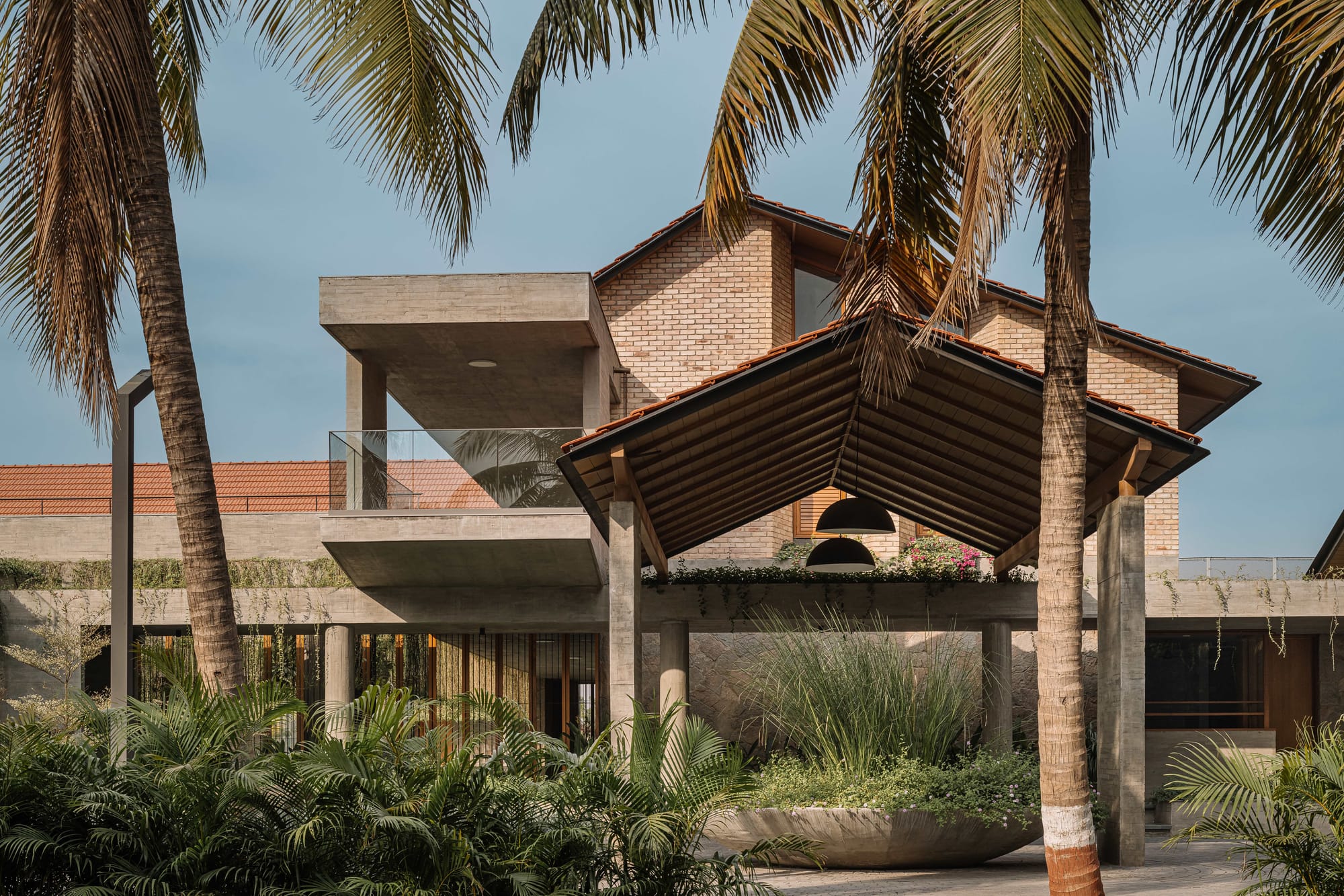 Two roads leading out of town intersect at The Retreat Home, a biophilic nine-bedroom holiday residence in Surat, carved like a grotto into a cinnamon-brown expanse of ripening chikoo (sapodilla) trees. Inside, the floor is pebble-smooth and almost mirror-like, clad in Kota stone, while the ceiling evokes the opaque greys of a monsoon sky. Envisioned in the likeness of Le Corbusier’s proto-Brutalist style from the 1950s, this 47,210 sq. ft. villa orchestrates pitched Mangalore roofs, the raw starkness of exposed concrete, and the rugged integrity of Rajula stone masonry. Deep-set windows and louvered blinds trace the façade, casting cool, dappled shadows along its linear corridors and jharokhas, while red Agra stone pathways meander softly through the lawn. Beyond, in the orchard, new tendrils unfurl as vividly coloured birds flit across the branches, and the yolk of a morning sun spills tenderly over the awakening landscape.