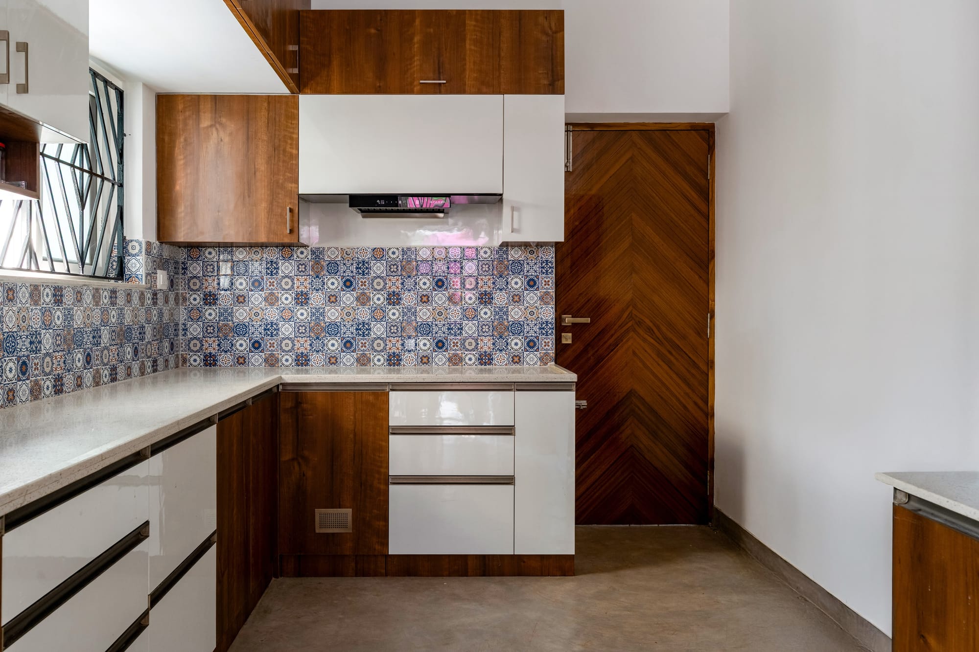 With most of her family and grandchildren dispersed across Singapore and other distant parts of the world, the matriarch’s homestead opens its arms through a traditional entrance porch featuring a thinnai, an intentional gesture of homecoming and a fitting reminder of rural living. Inside, the ground floor unfurls with the enduring craft of oxide flooring. The living room, visually contiguous with both the dining area and the stairway, is anchored by a large rectangular grille window that frames the suburbia beyond. A standout feature is the custom partition, with pastel glass inserts depicting scenes from Malayali heritage that honour the daughter-in-law’s ancestry, alongside motifs drawn from Chennai folklore that subtly acknowledge the son’s family roots.
