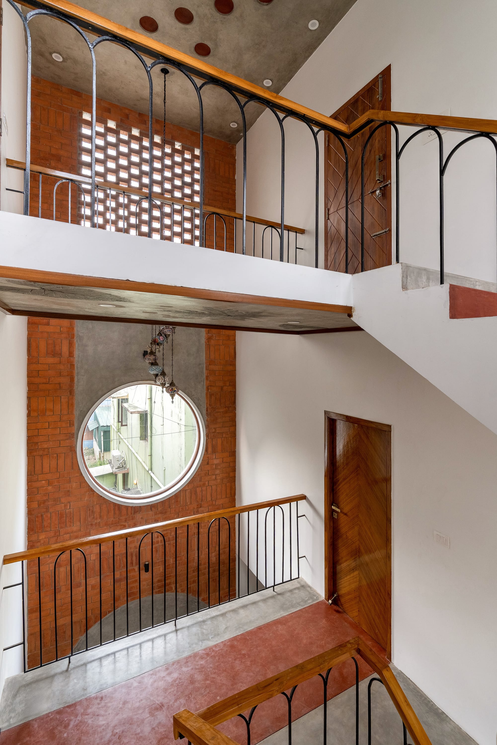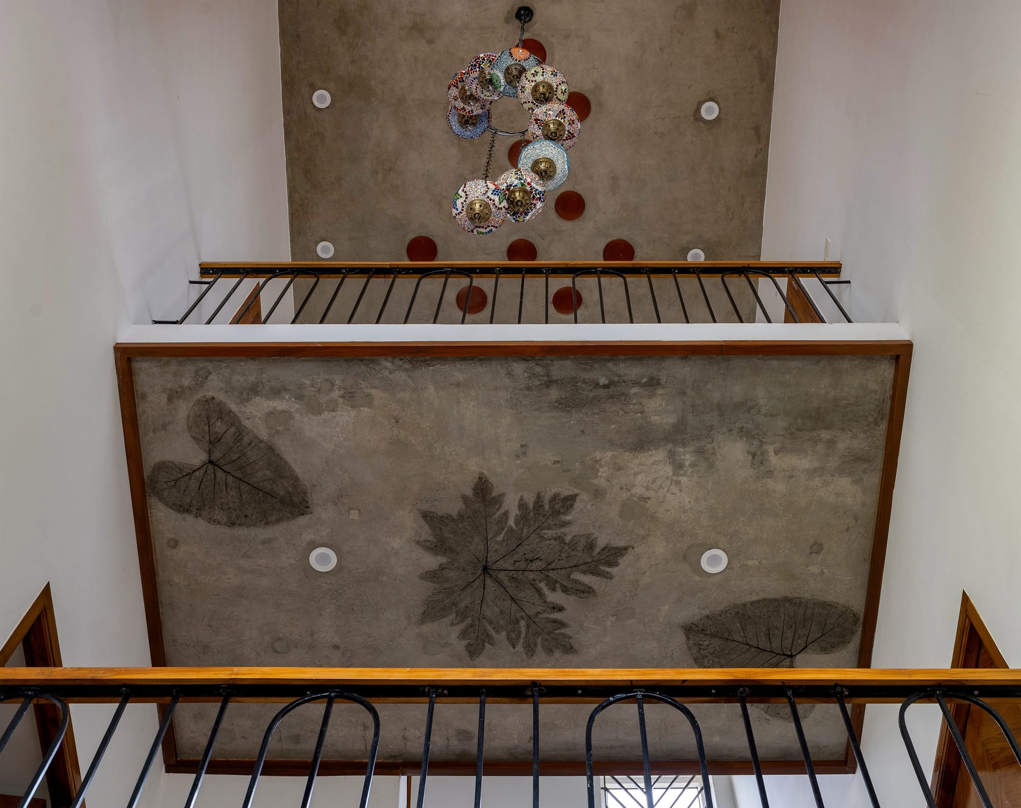 The individual bedrooms are kept tastefully retrained in ornamentation, with attention drawn instead to the cloudy, mineral-green oxide flooring underfoot, which comes alive in abundant natural light and thematically ties in with views of the surrounding vegetation. As the eye moves up the stairs, the first-floor walkway ceiling reveals a startling detail: leafy fronds and lily pads imprinted directly onto the concrete, lending site-specific wisdom and a dash of storytelling. Higher up, the topmost ceiling is a masterclass in the filler slab technique, with clay pots embedded within the cement slab to mitigate heat gain while lending a subterranean feel to the otherwise bare interiors.