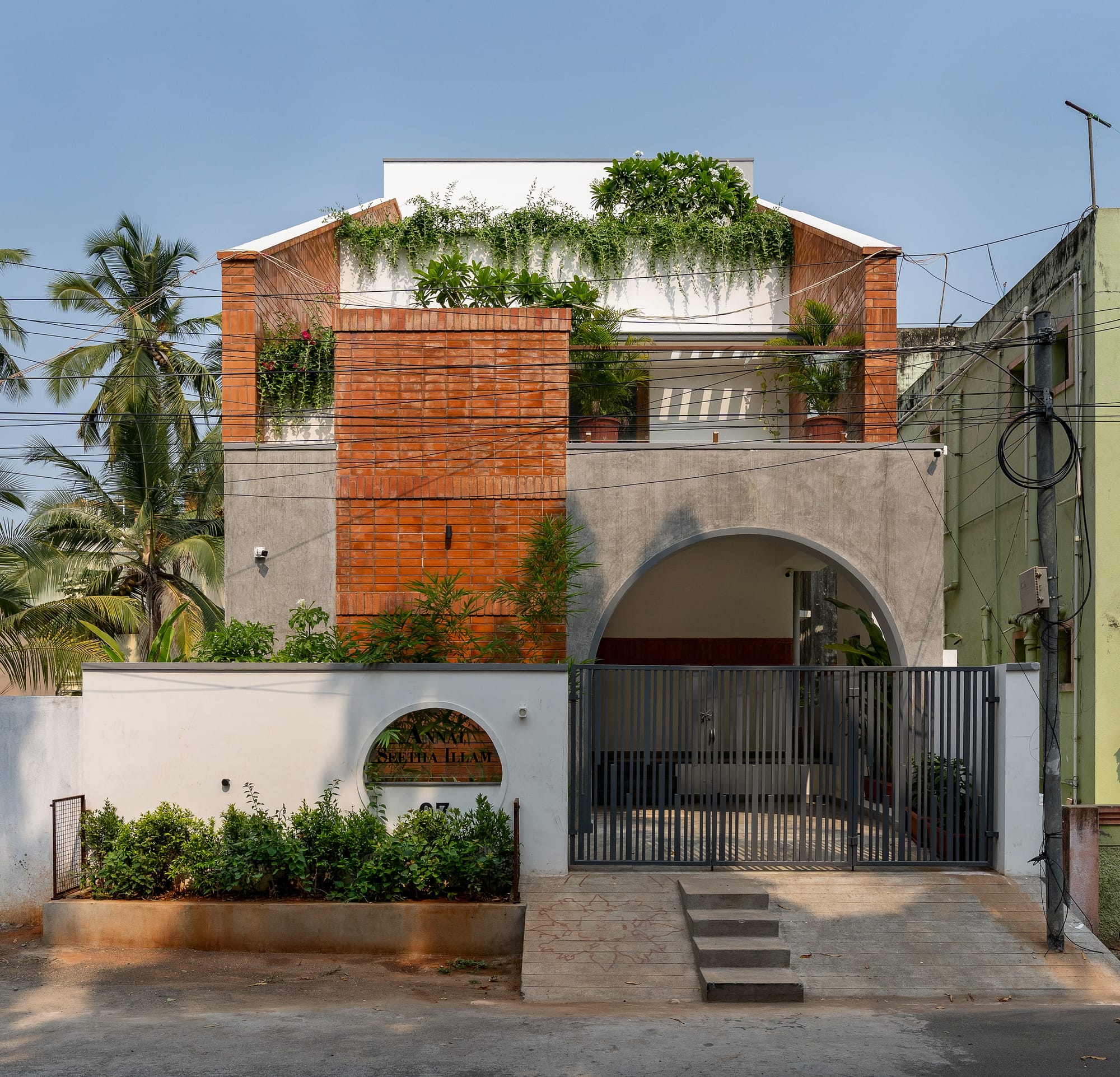 Protruding from the first-floor bedroom terrace, a knobbly stick nudges the backyard mango tree’s overladen branches to give up their bounty. As the equatorial sun rises, light dribbles down the home’s east-facing, staggered façade. Amid the din of cycle bells, grazing cows, and early morning temple chimes, the 2,640-square-foot Suvadu – Annai Sita Illam slowly awakens to the neighbourhood of Ullagaram in Chennai.