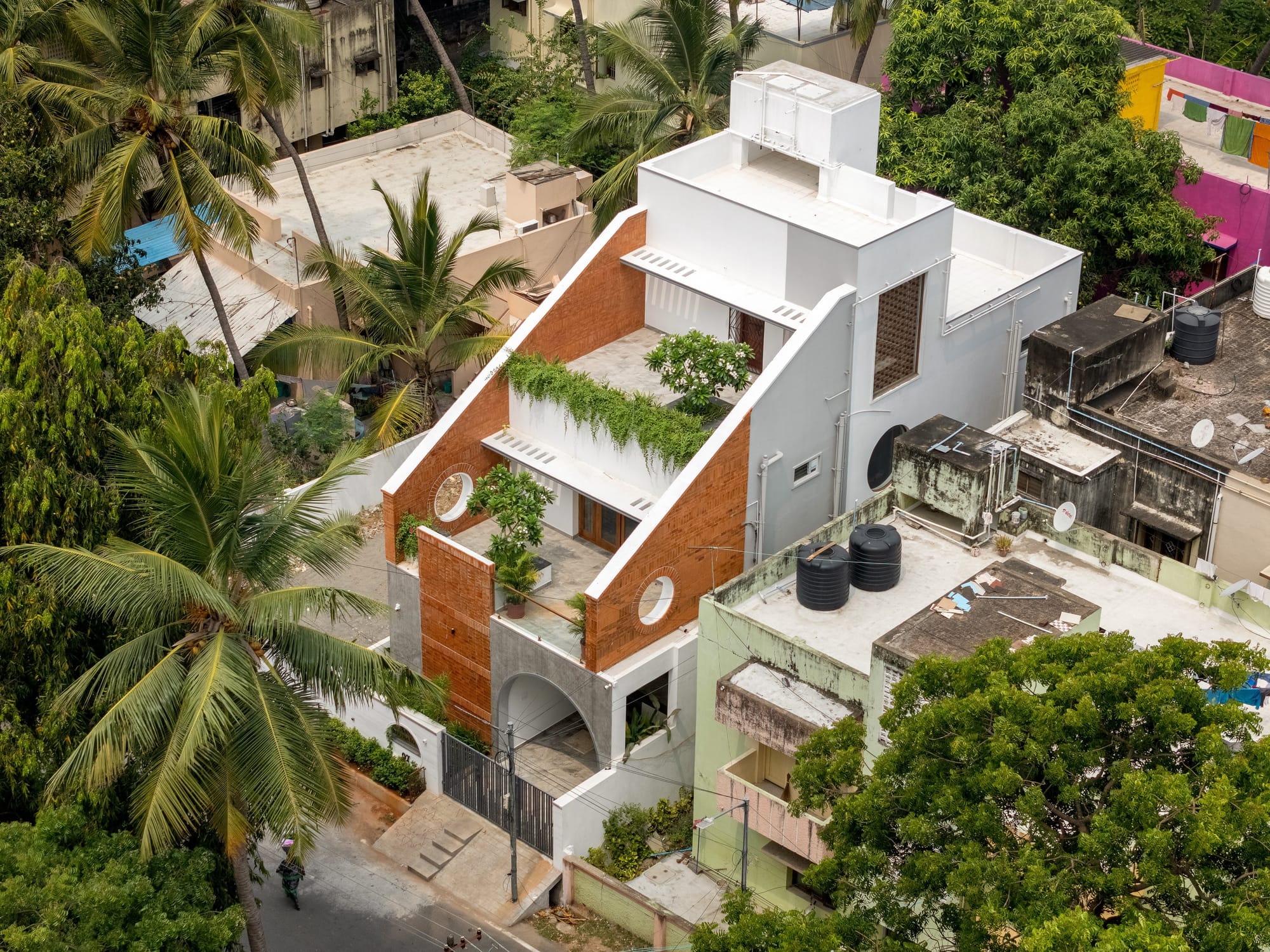 Standing upon the shoulders of Chettinad, coastal, and context-driven architecture, this residence by the multidisciplinary design firm D.L.E.A is unfettered by the spatial limitations of its narrow 26’ x 87’ plot. The design language veers towards functional minimalism, with ruddy brick-clad walls and private thinnai-like terraces, while the interiors remain in constant dialogue with the homeowners’ personal landscape of memories through evocative ceilings, nostalgic oxide floors, and sculptural arches.