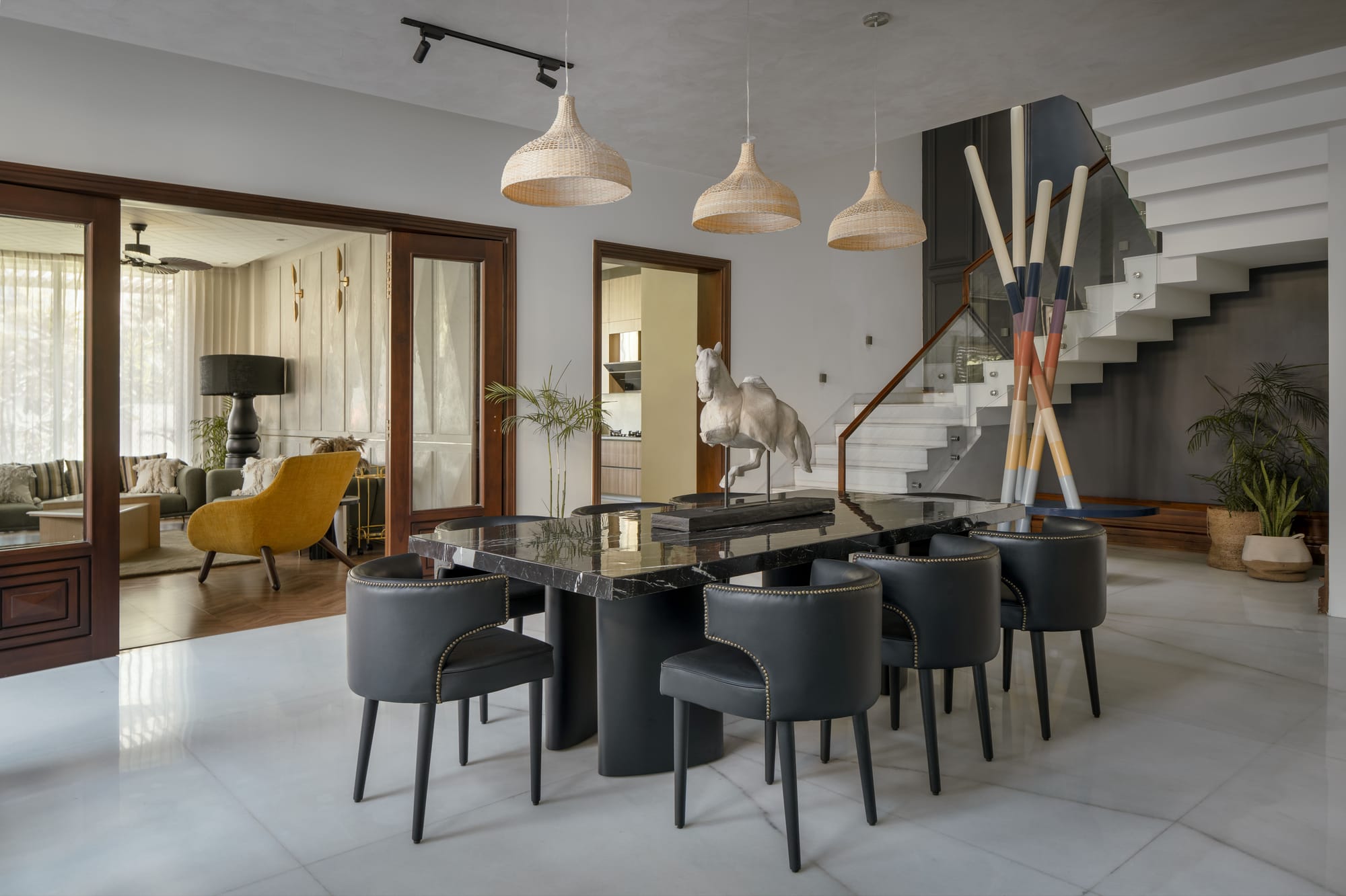 Natural light suffuses the dining room through central atrium skylights, while lush house plants and expansive openings maintain a fluid continuity with the outdoors. A formidable double-pedestal table with a regal black marble top takes centre stage. Surrounding it are leatherette barrel chairs, their classic mid-century lines and nailhead trim balancing nostalgia with subdued grandeur. At the foot of the monolithic staircase, a cluster of colourful poles sprouts in artful disarray, injecting dopamine décor, into the otherwise measured elegance of the space.
