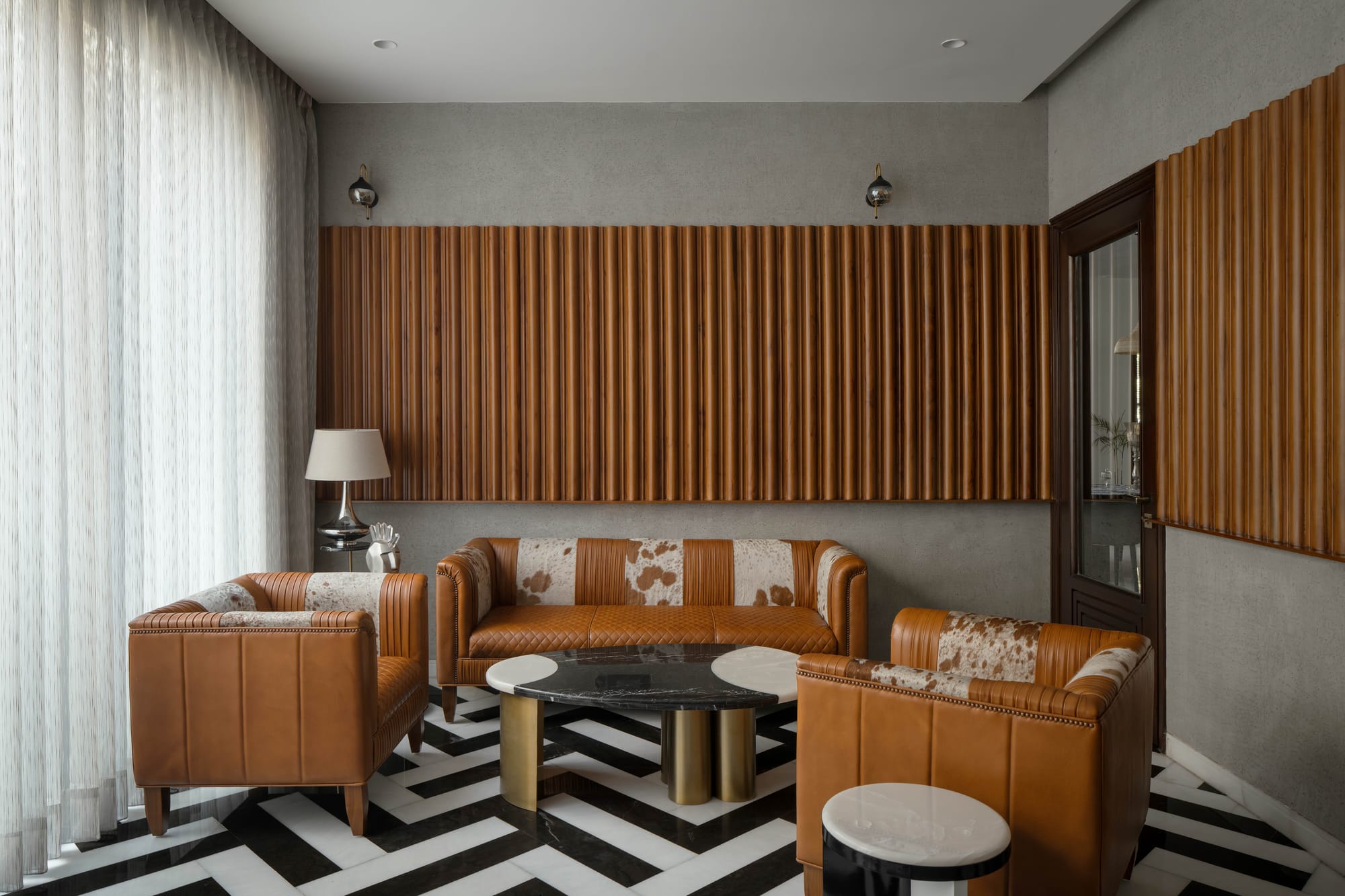 Adjacent to the drawing room, the bar is where hedonism retires in style for a nightcap. Defined by a sultry, polygonal counter that glistens like poured obsidian, this space is tastefully cocooned like a time capsule from the Prohibition Era. The surrounding walls, sheathed in repurposed wooden battens, insulate the acoustics and lend a sonorous cadence to the space. Underfoot, supple Indian stone in a herringbone inlay, elongates the room, offset by distressed tawny leather sofas with cowhide flourishes.