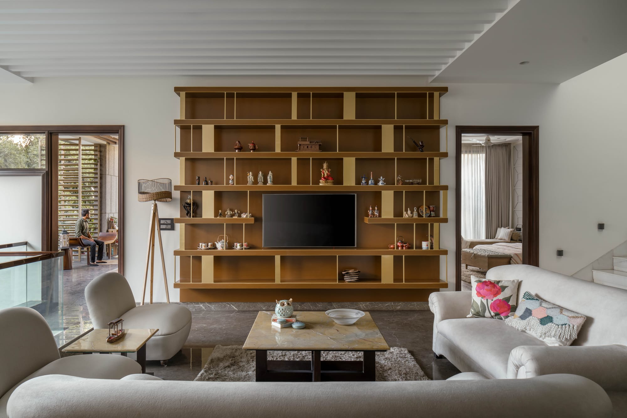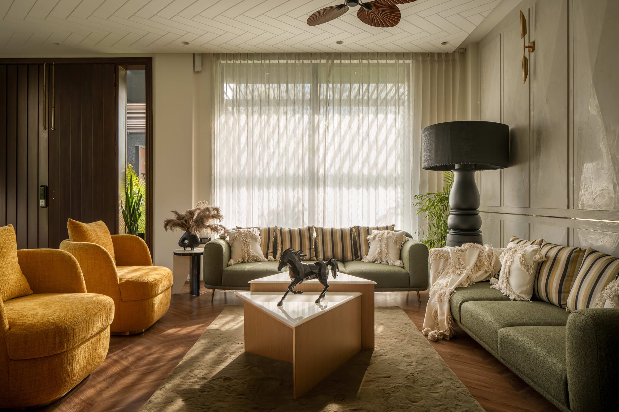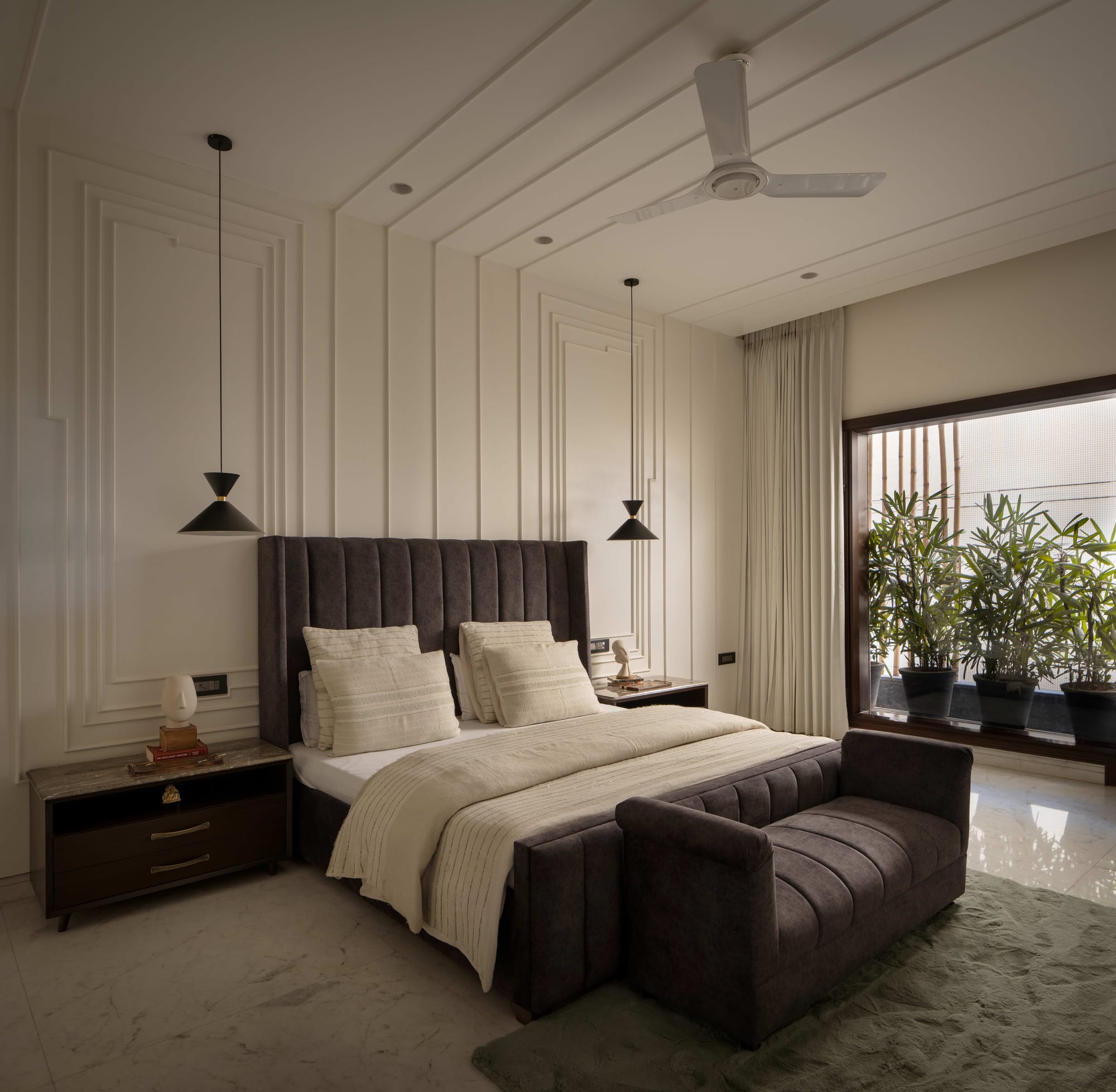 At Twin Villa, an essentialist grammar emerges from the discourse between solidity and voids. In the bedrooms, the massing is thoughtfully carved to accommodate swanky en-suites, private balconies, and light-filled volumes that extrapolate calmness beyond their walls. Fluted cladding, elaborate wainscoting, and airy false ceilings add dimension without overwhelming the senses.