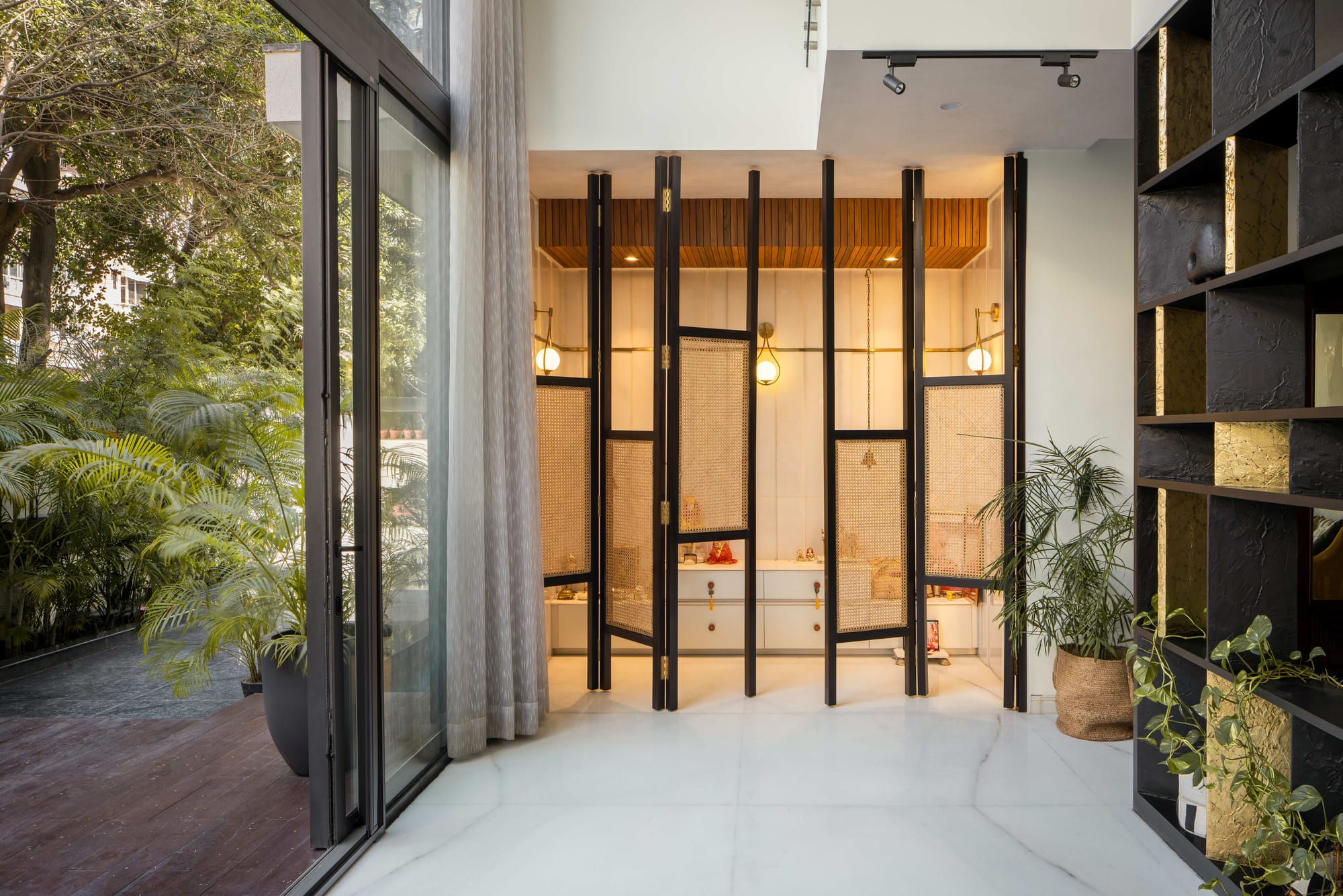 The entry to Twin Villa unfolds through a double-height foyer, where an ornate feature wall is patinated with an Art Nouveau-inspired antique gold and stucco finish, establishing a warm, weathered opulence the moment one steps into the mansion. Just beside it, a Colonial rattan partition takes on a new life as foldable panels that hover lightly between floor and ceiling, impervious enough to screen the pooja area but not severing the visual connection completely.