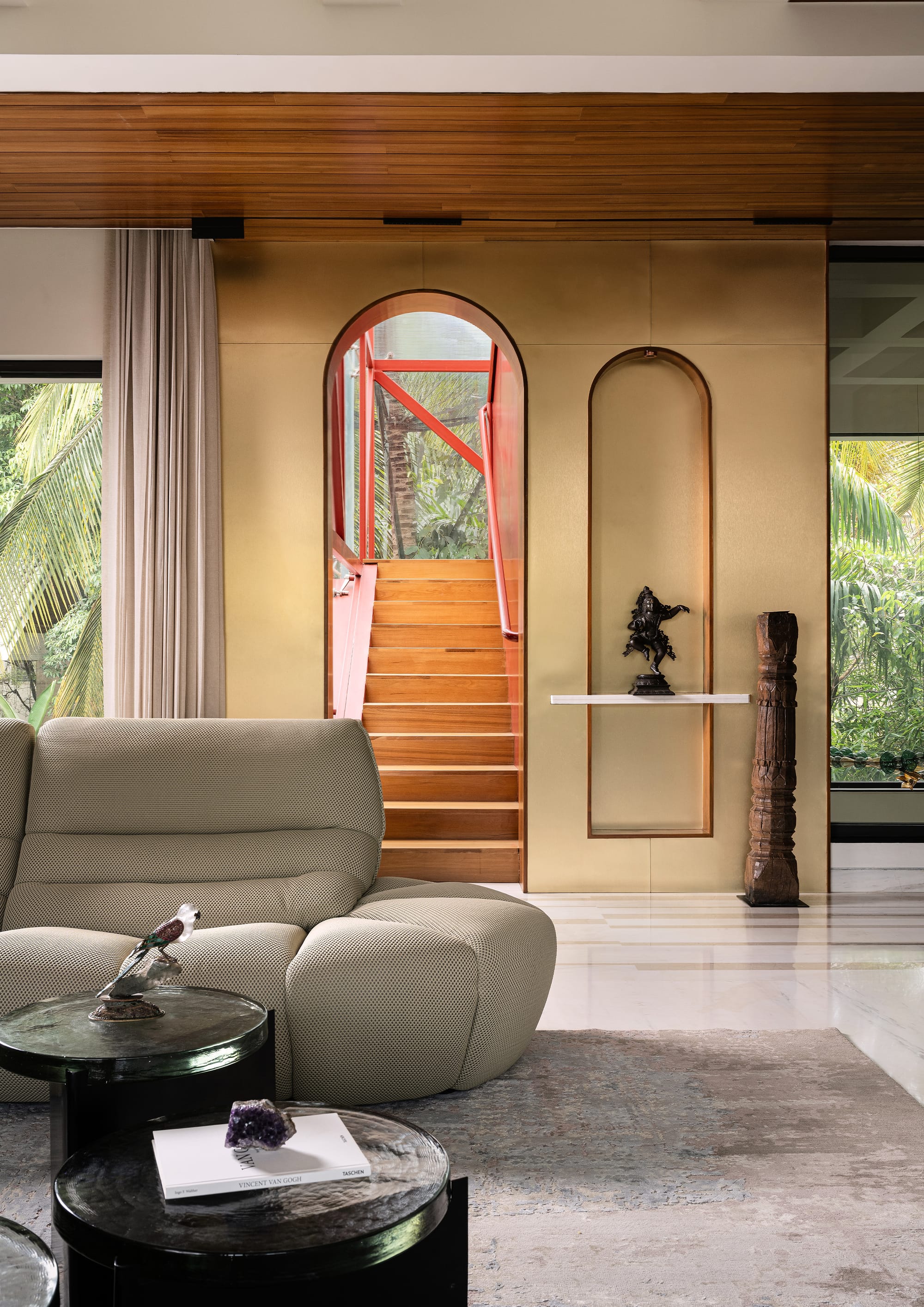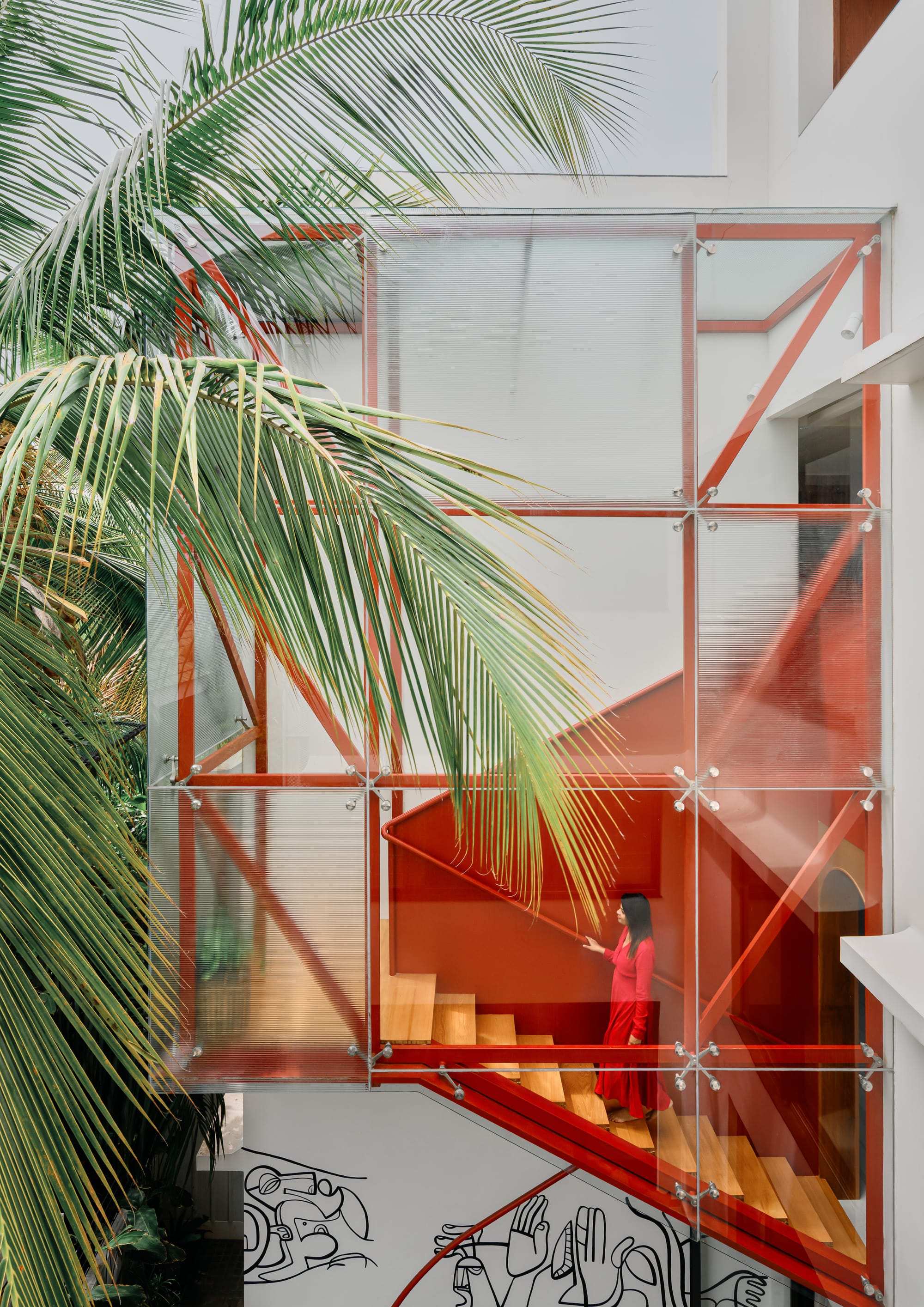 This upward narrative culminates dramatically with the floating crimson staircase that connects the first and second floors. Encased in glass and steel, this floating red metal structure is an intentional architectural punctuation mark—a high-drama ascent where fiery-red mullions and galvanized iron create a sense of levitation, perfectly capturing the spirit of soaring heights. “For us, it’s not just a staircase, but an artwork in itself”, Ar. Amirah exclaims.