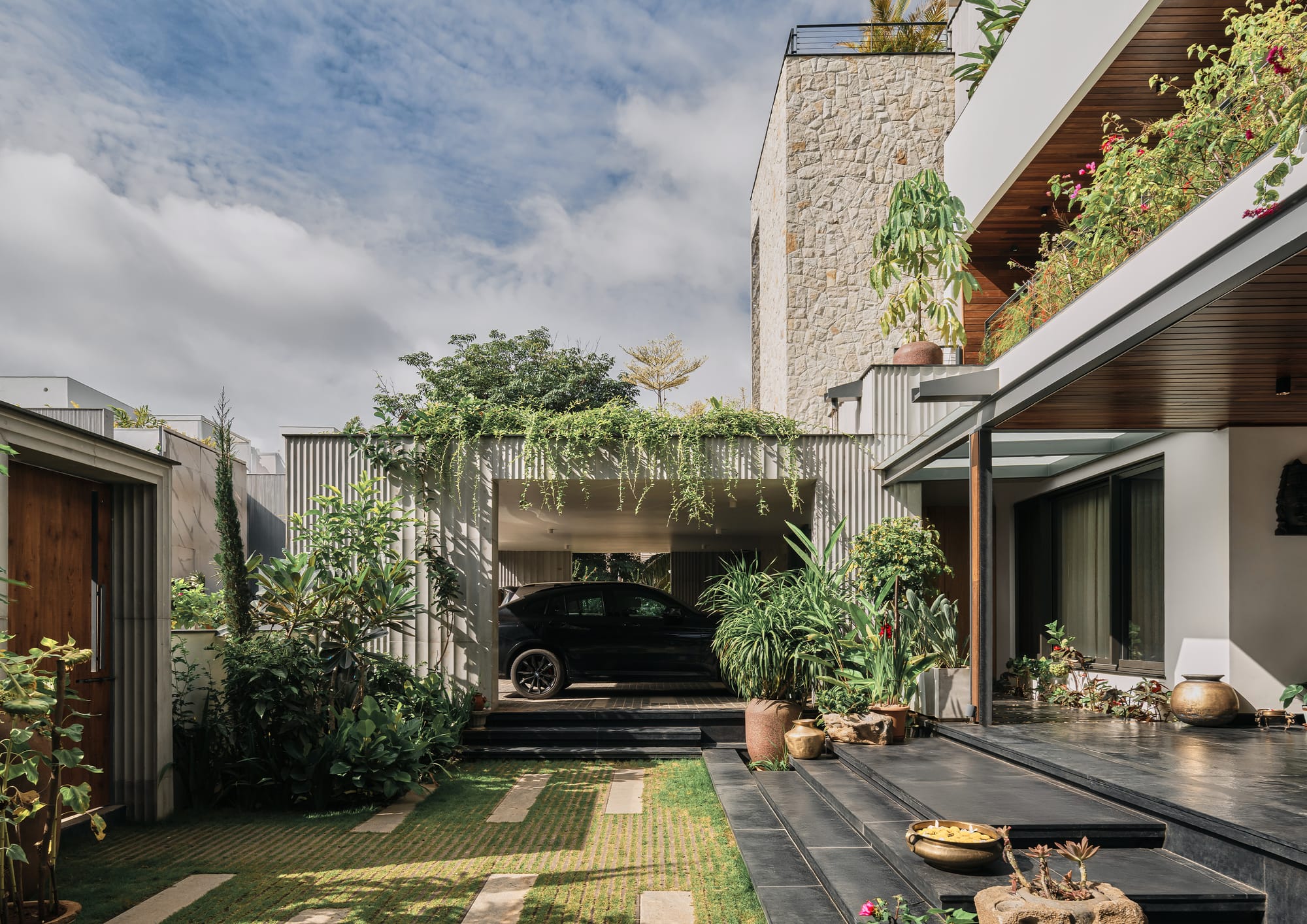 “Vyōmam is a home that folds into the sky,” Ar. Amirah remarks. “It is like a dialogue between earth and ether. Here, architecture doesn't serve as a shelter, but shapes serenity, connection, and continuity (with the sky & surroundings),” she says. Owing to Sarjapur’s gentle climate and generous green cover, the architect went with a purposefully porous home that blurs the boundaries. The façade itself is a simple yet strong interplay of fluted concrete panels for linearity and random rubble cladding for texture, streaking the levels with integrated foliage.