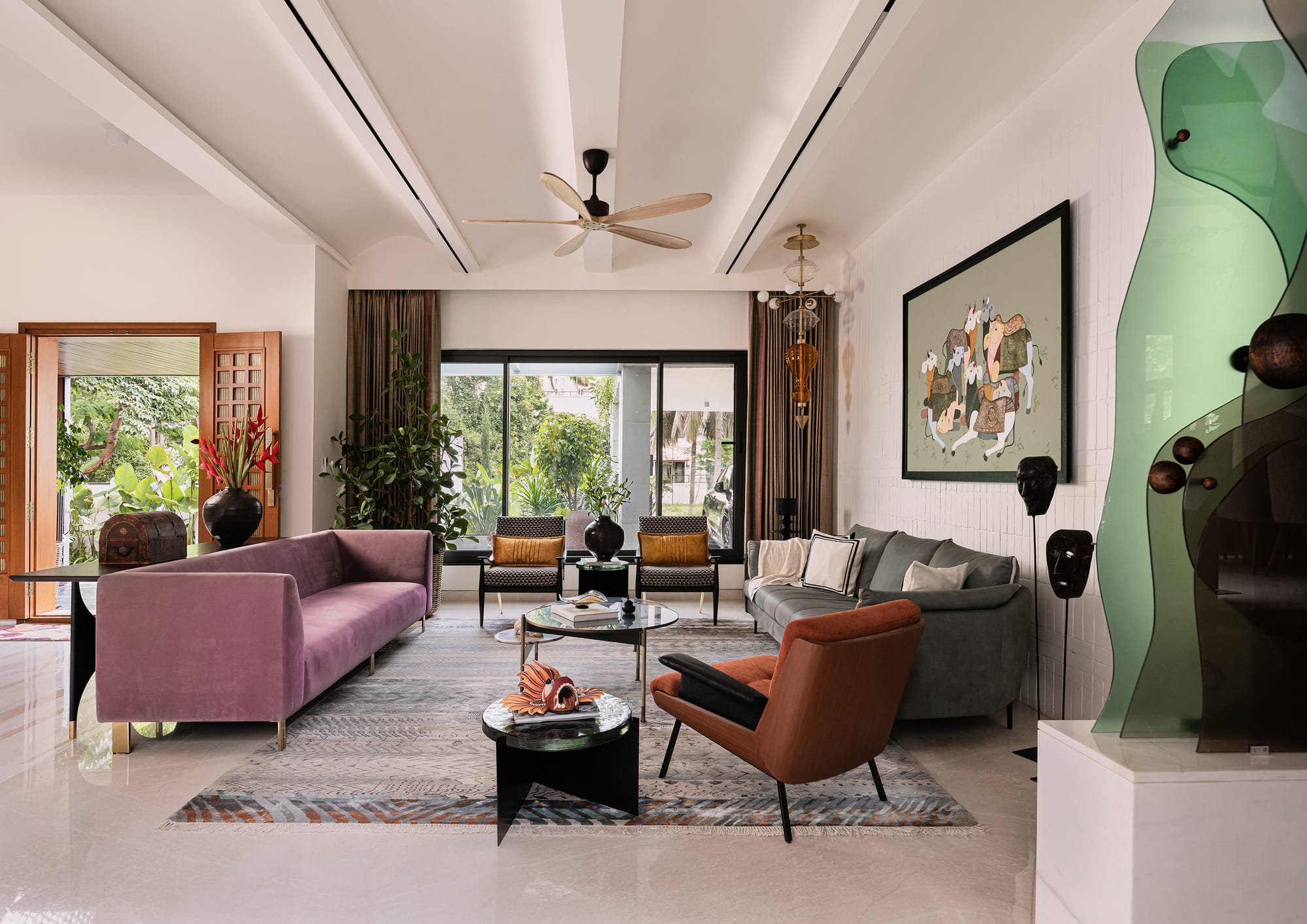 Homes often take on the personality of their owners, reflecting their desires through architectural form or design elements. This 17,500 square-foot Bengaluru residence is a little different, though. It translates the lifelong passion turned profession of the homeowner, Ramineni Ramachandra Rao—a veteran defense specialist and aerospace engineer—into a warm, grounded sanctuary. Conceptualised and executed by Ar. Amirah Ahamed & her team at Bodhi Design Studio, the very essence of the house reflects the journey of Ramineni’s life through the vast, infinite sky into the intimate core of his family life: tangibly through bespoke elements, intangibly through the home’s open, fluid feel, and metaphorically through its name, Vyōmam, meaning "Boundless Sky."