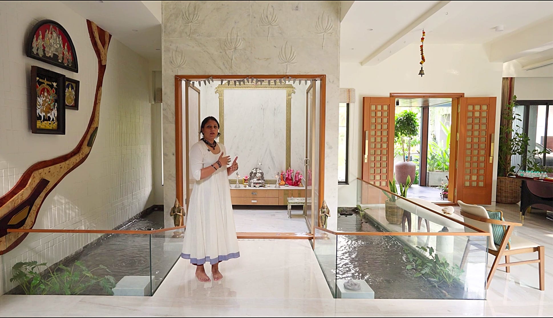 Instead of restrictive walls that make a typical shelter, the architecture here employs layers—courtyards, waterbodies, and deep verandahs—to mediate between the tropical outdoors and the lived experience indoors. This mediation is governed by the two primary axes: the East-West axis, which guides the main living flow, and the North-South axis, which defines the entry sequence. The transition from the public realm to the private home is marked by distinct thresholds, starting with the front garden, followed by the verandah, and finally the waterbody at the outdoor foyer, ensuring a gradual and deliberate passage into the home. This strategy also honors Vastu while helping in optimal cross-ventilation and passive cooling, essential for the Bengaluru climate.