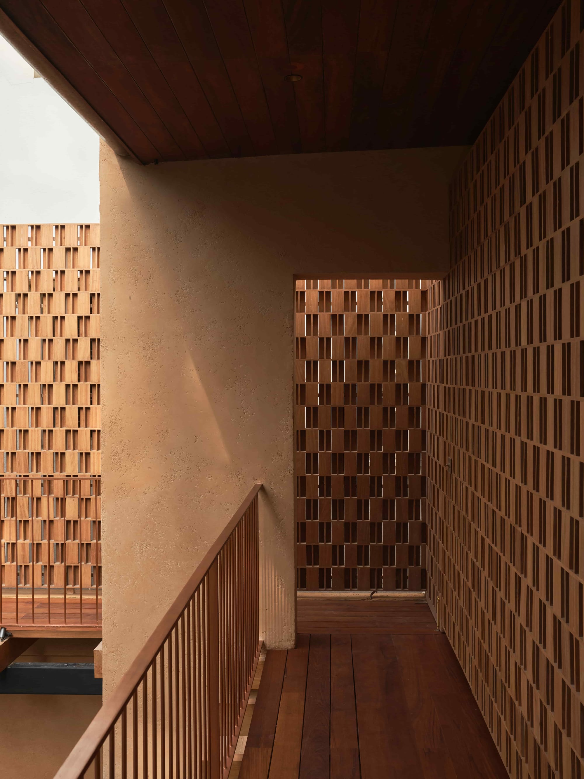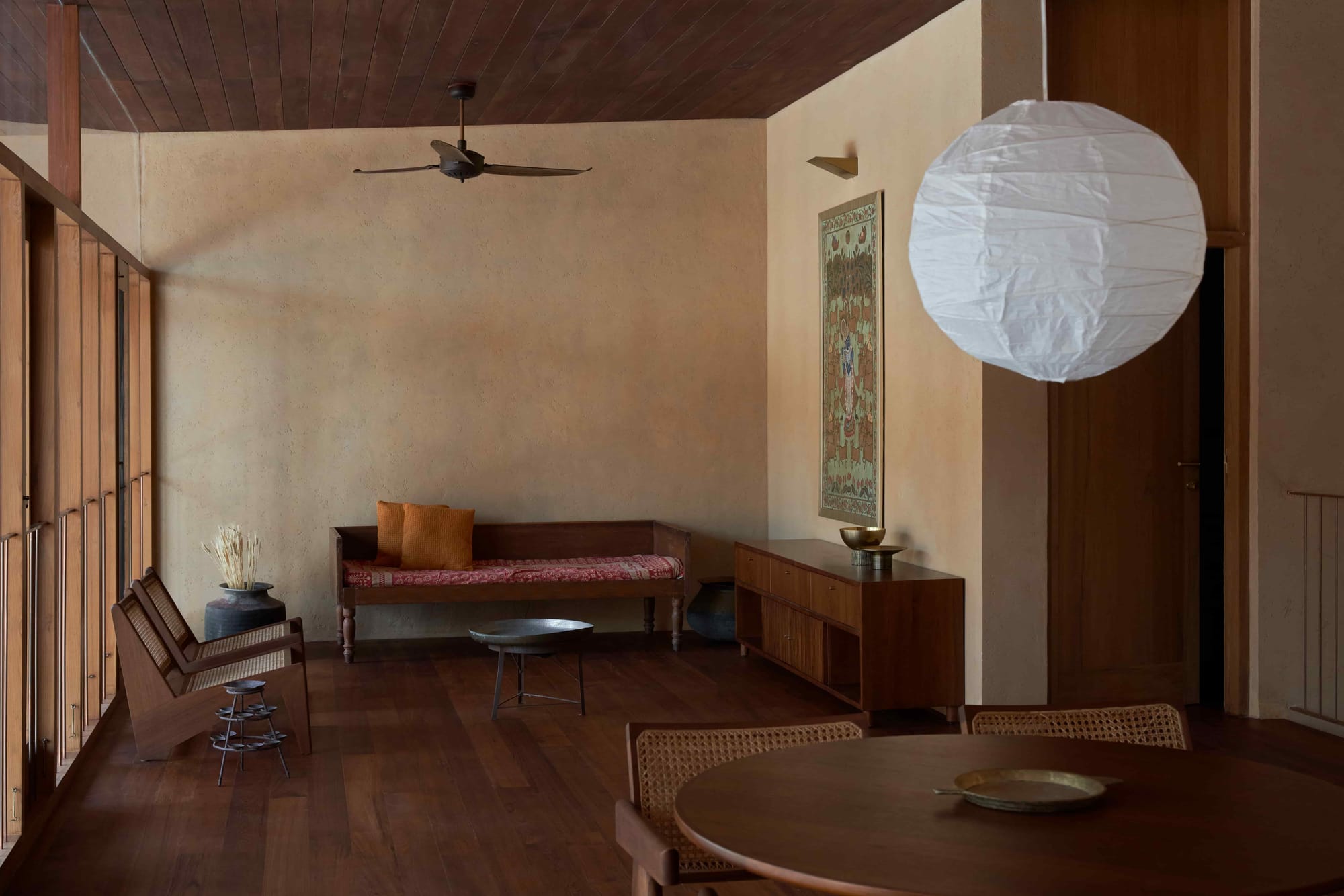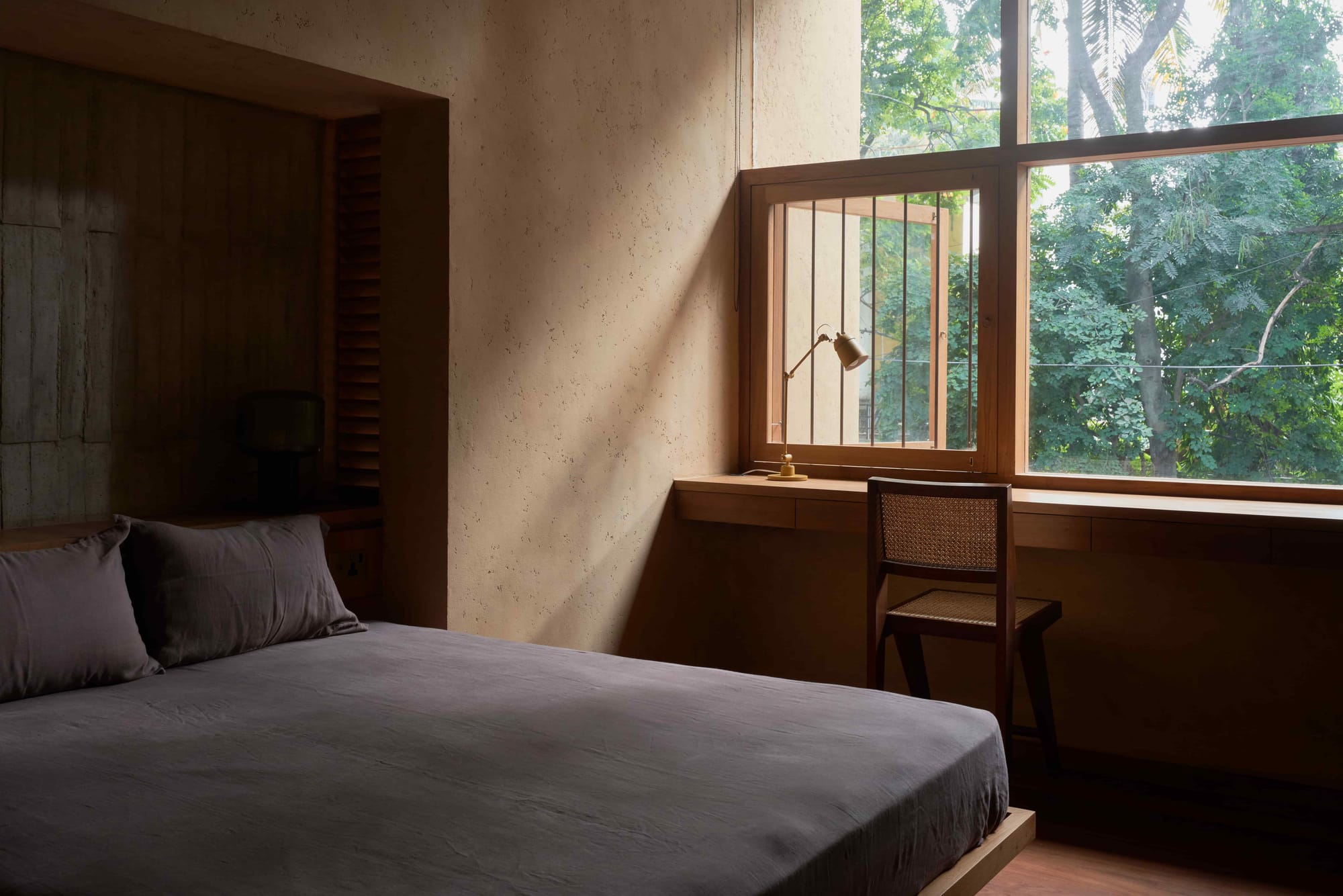 The facade, finished with earth-pigmented plaster and brick, offers little to the street, acting as a protective husk. But as one crosses the threshold, there is a "measured unfolding." The transition from the dusty urban surroundings to the inner sanctum is choreographed through a series of verandahs and semi-open spaces. Here, the boundaries between inside and outside are intentionally blurred. Timber shutters and jaalis (lattices) provide privacy from neighboring buildings, yet they allow the Bengaluru breeze to filter through, carrying the scent of stone and jasmine.