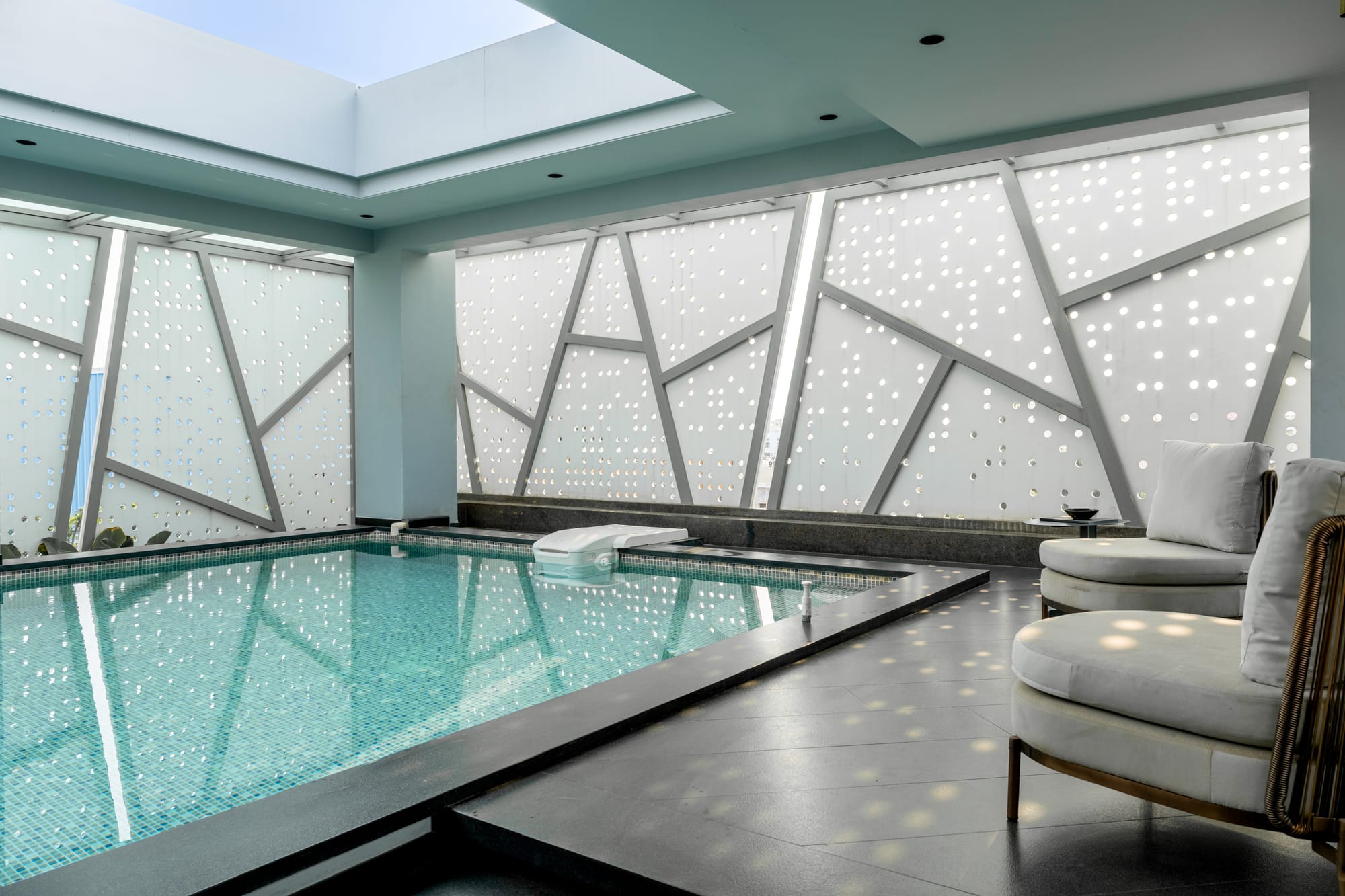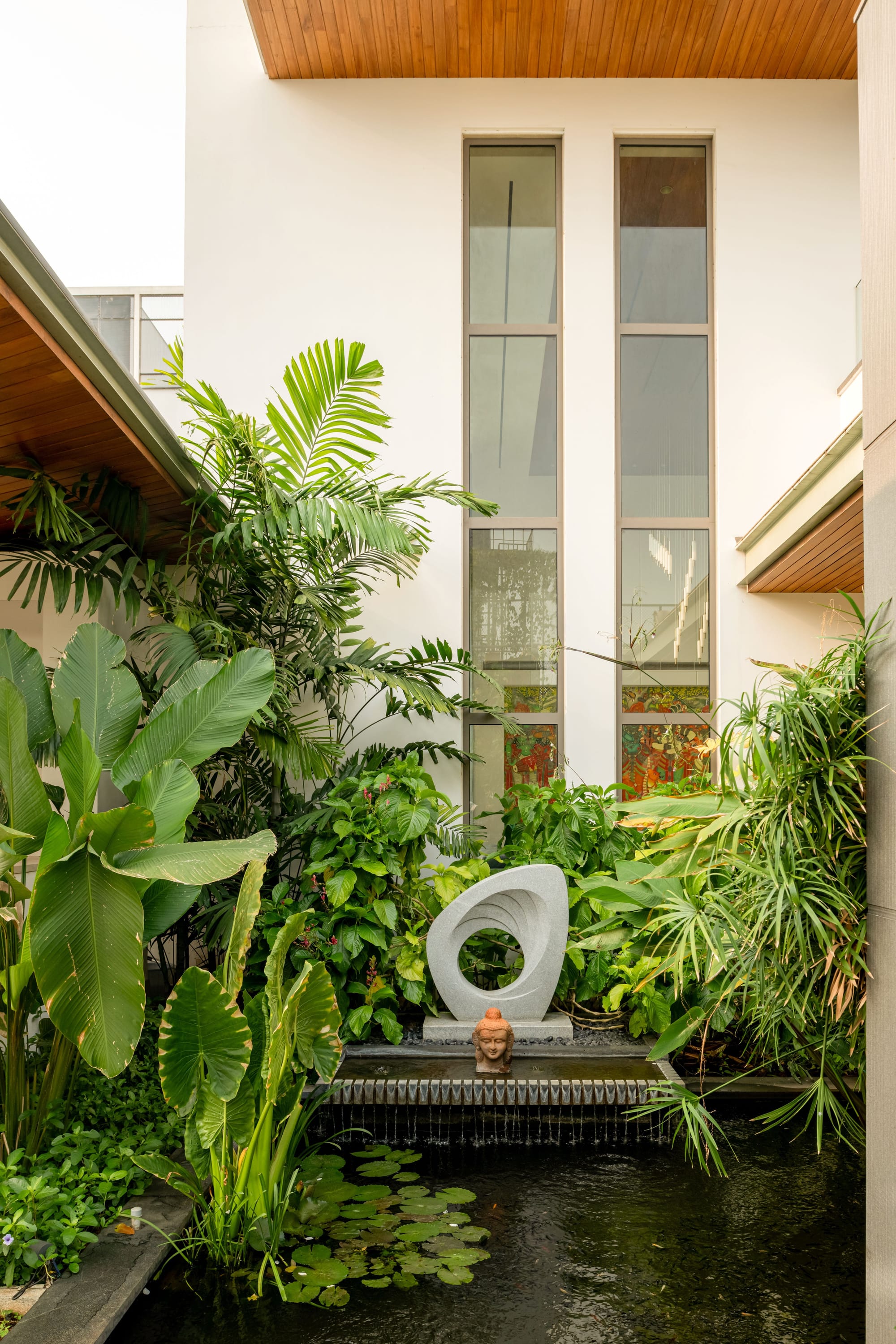 The ceiling is staggered in two levels with groove detailing, while the lighting is kept minimal and ambient, casting a pleasing radiance. Beyond the suite lies a walk-in dressing area with bespoke wardrobes, followed by a tropical modernist bathroom that fans out into a miniature garden patch beneath a skylit ceiling.