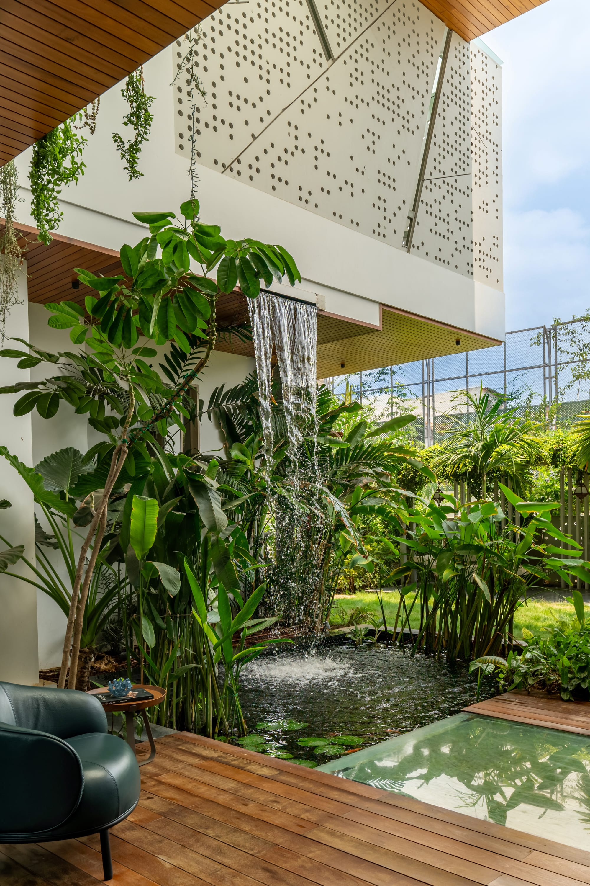 The central garden flushes out the island heat effect, featuring a koi fish pond animated by a picaresque waterfall gushing into its depths. A wooden deck walkway stretches across the water, with a glass insert that creates the illusion of walking directly above the surface. A stone-paved path meanders toward a cabana, where a curvilinear stone bench invites moments of reverie or whispered conversations. Inspired by the principles of Zen gardens, this space coaxes the indoors to dissolve subtly into the outdoors, turning the rituals of daily life into spiritual acts of mindfulness.