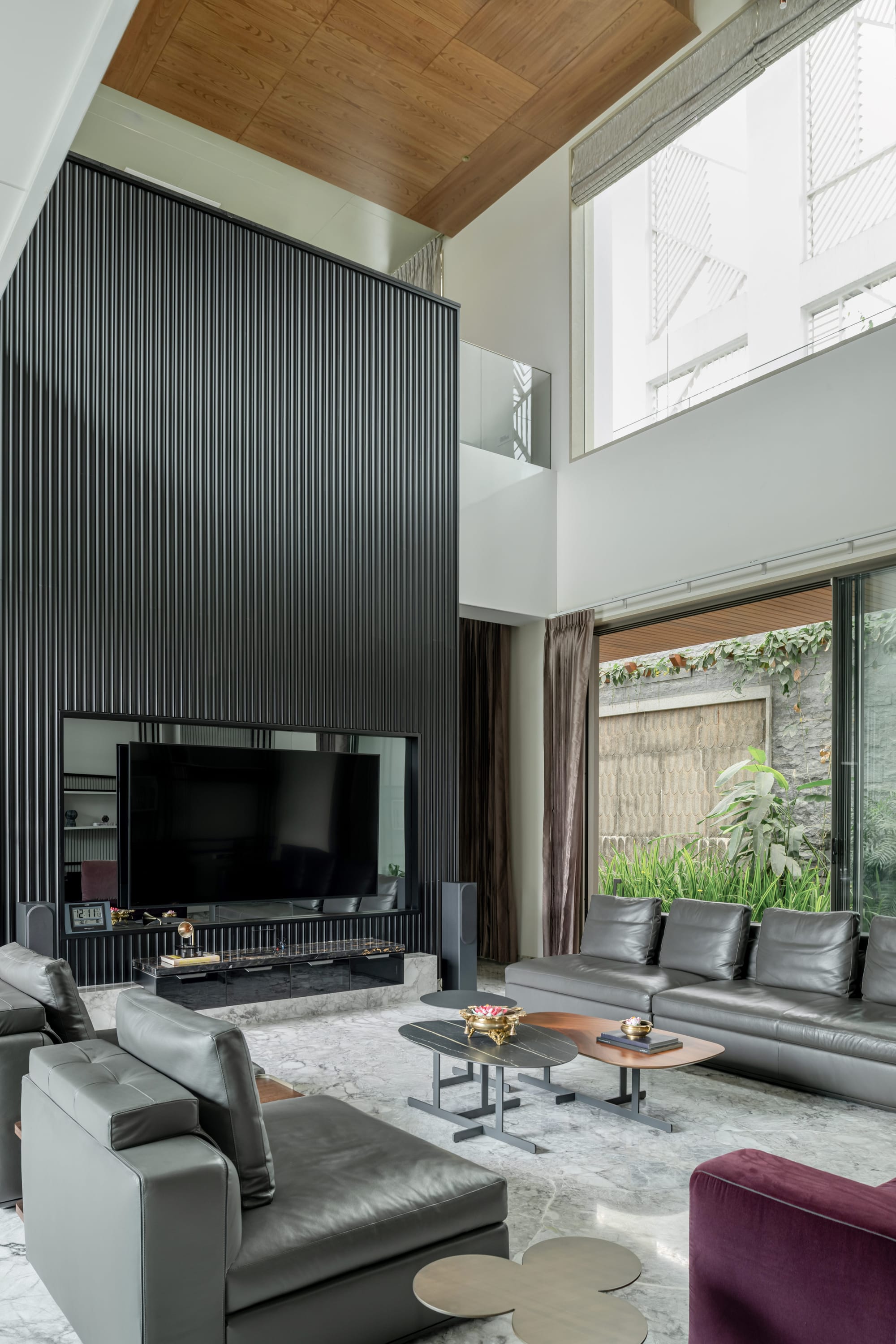 Defined by a rarefied double-height volume, the family lounge fosters an inward-gazing contiguity between levels, offering panoramic views from the first-floor corridors and balconies. This geographical and emotional nucleus of the home is carefully demarcated into two atriums: one housing the family living area and the other the dining room, both oriented to overlook a viridescent, triple-height garden. From the dining space, one can peek into an ergonomic kitchen, in tune with the golden triangle of workflow between the stove, sink and refrigerator.