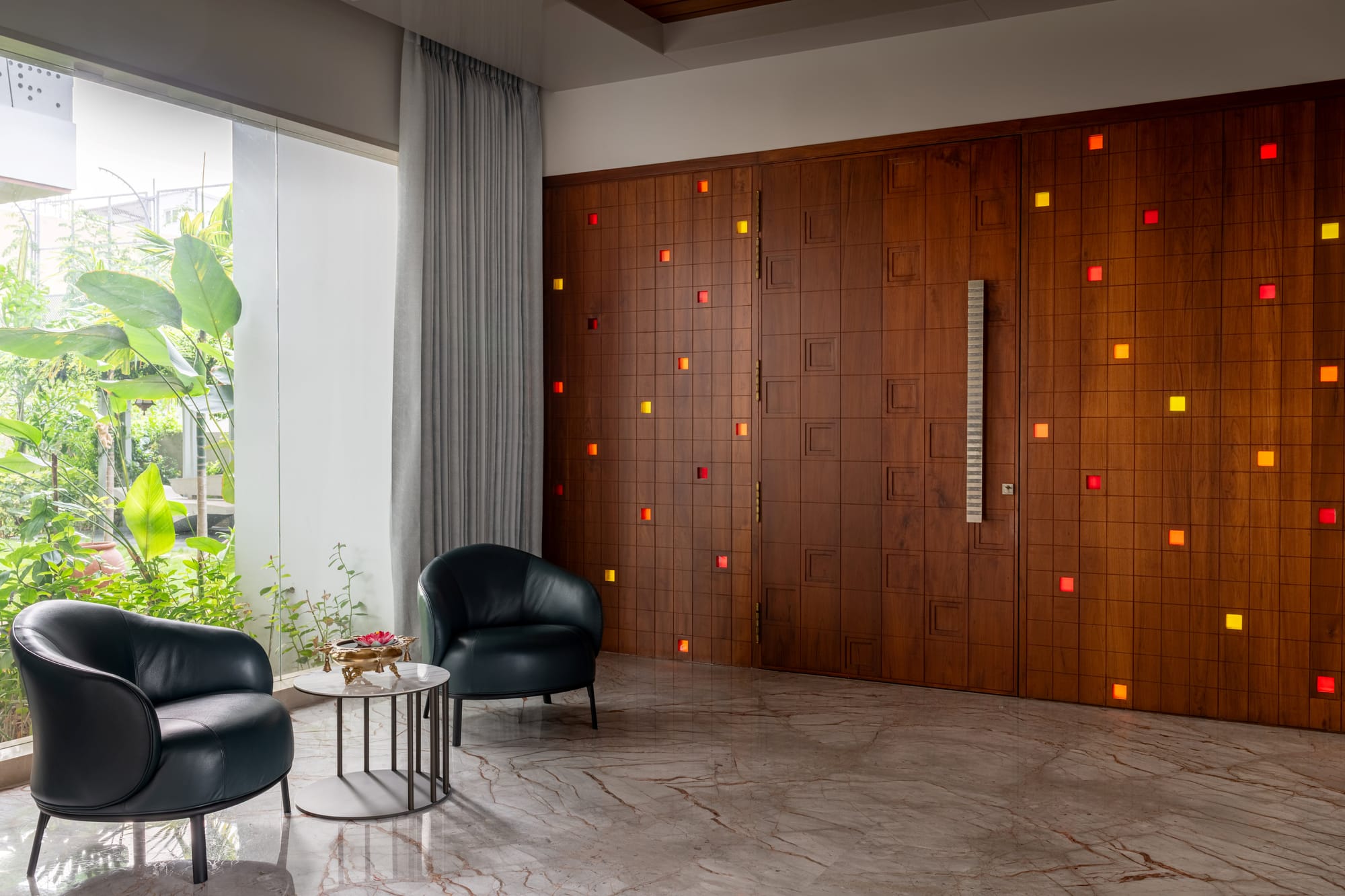 At the end of this passage, partially veiled by foliage, a wooden door waits. It marks the top note in a home that suffuses itself gradually like perfume; every surface and antechamber, every filtered shaft of light, contributes to an elaborate game of hide and seek. Embossed with colourful perforations precisely cut into wood, the main door evokes the legacy of shisha or mirror-work embroidery, a craft deeply rooted in Tamil Nadu’s cultural fabric.