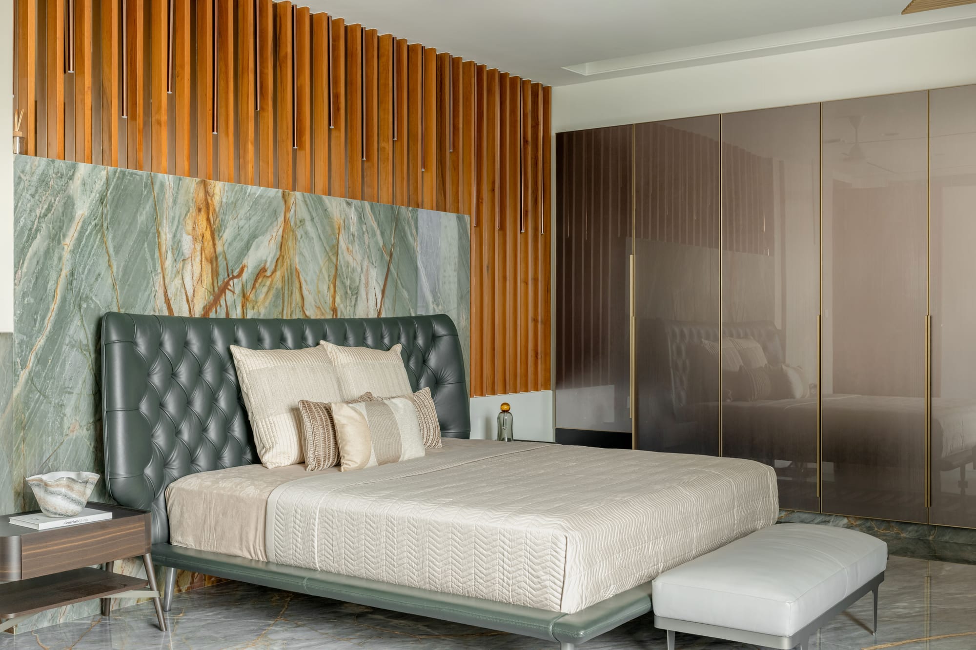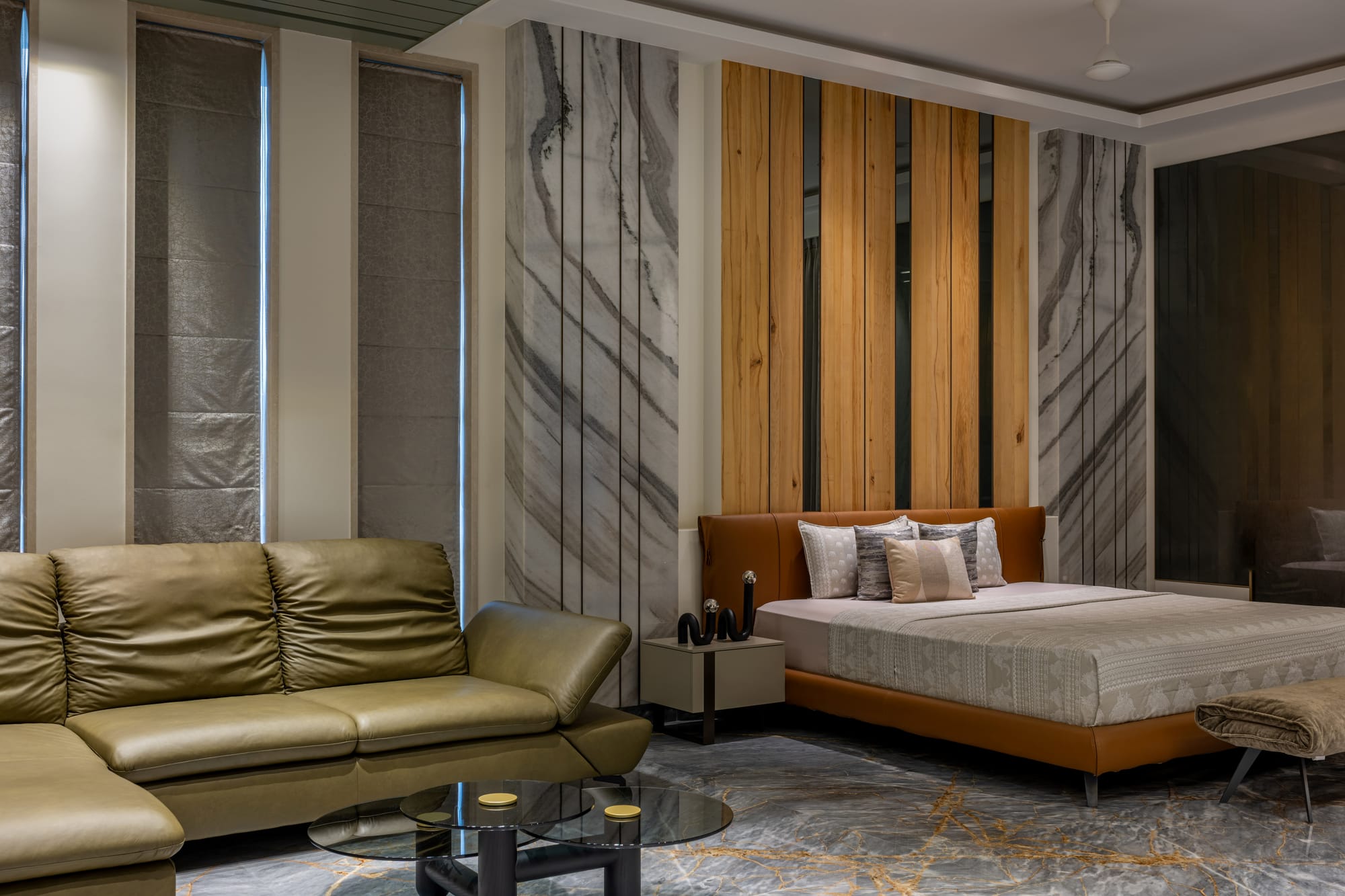 The east quadrant of the ground level is blessed by the puja room, positioned in close proximity to the master suite. This juxtaposition is no coincidence; it acts as a mediator, allowing divinity and a sense of stillness to trickle into the most private quarters. The master bedroom, in contrast, taps into the machinations of luxury, not garish in appeal but supplicating to the simplistic worldview of the homeowners. The flooring is sheathed in Grey Emperador marble, while wall panels in fluted veneer and grey mirror uphold a subdued interior language.