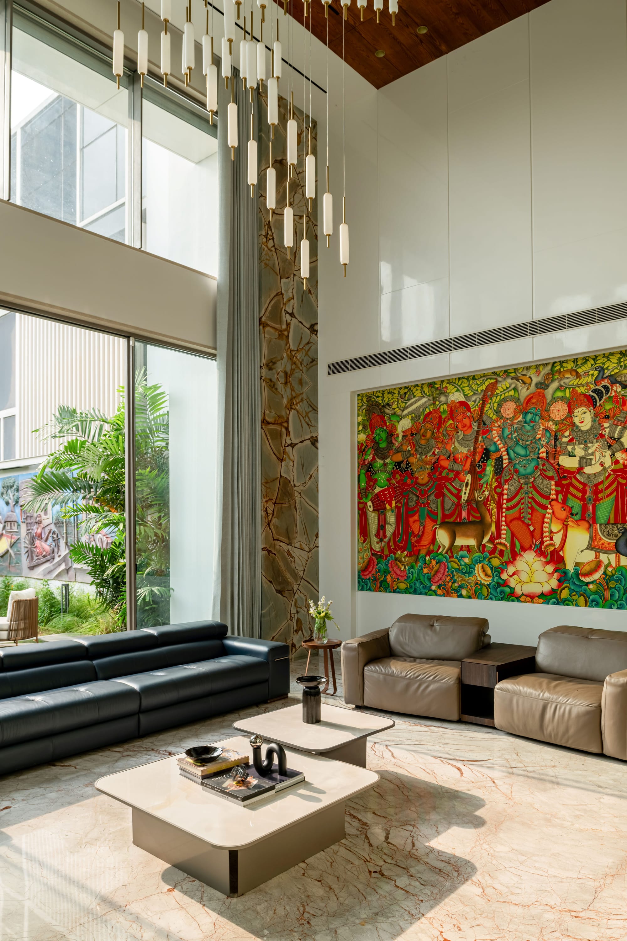 The formal living room is a cavernous, double-height volume that unfolds like a nervous system, reaching out into a semi-private garden, poking curiously into the main courtyard, and rotating its vistas toward the upper-level balconies. Large windows smuggle profuse light into the space, while the lofty ceiling height promotes convective cooling, reinforcing the home’s passive design ethos. Offsetting the verticality is a formidable mural inspired by Kerala’s temple frescoes. Traditionally found in the palaces and sacred shrines of southern India, these paintings are venerated for their effusive colours, intricate brushwork and mythological storytelling. Here, the mural delivers a resonant chord of gravitas, in sync with the spiritual rhythm of the space.