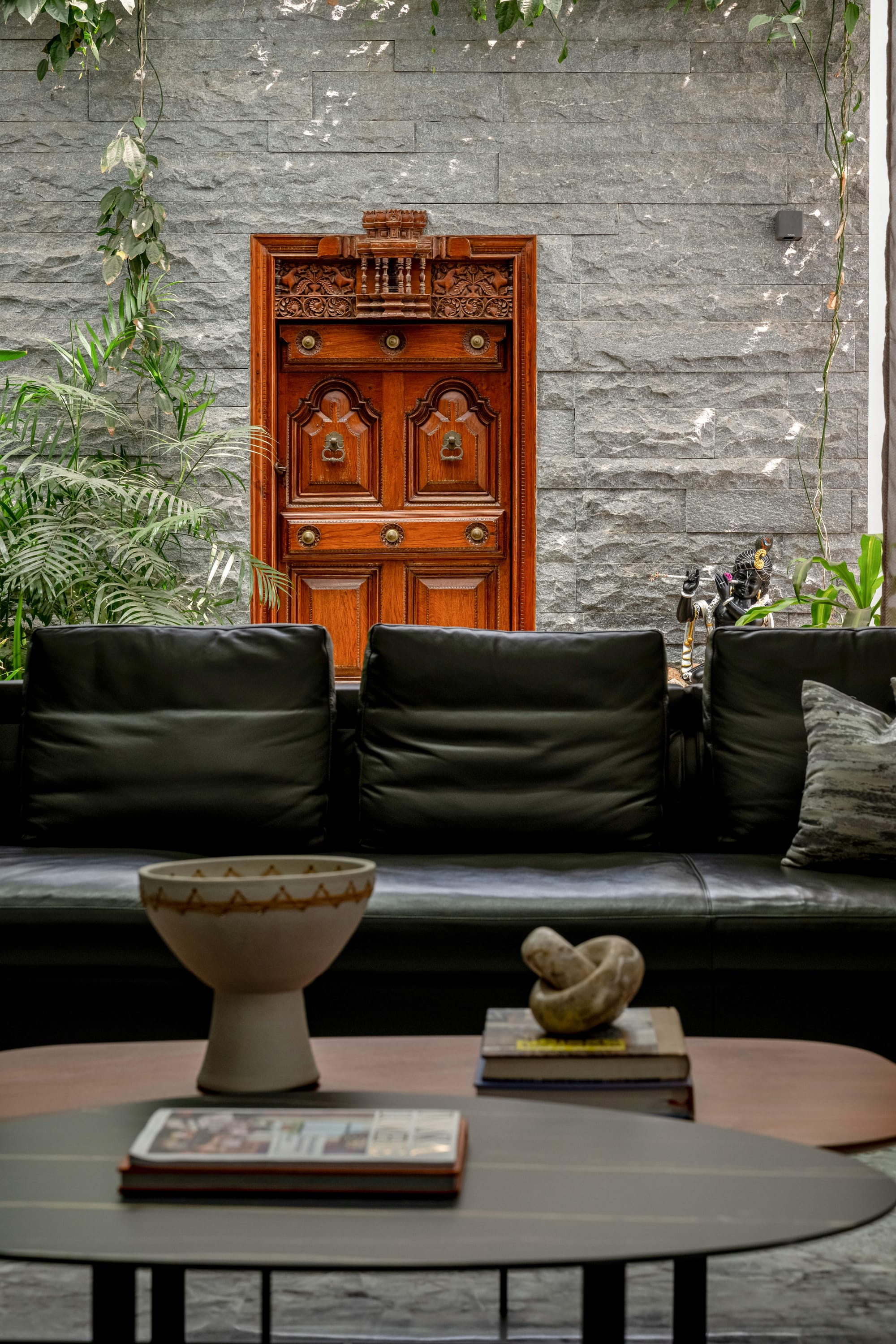 In the courtyard, a gloriously carved Chettinad mansion door is repurposed as a conversation piece. Hewn from rich hardwood and adorned with luminous brass, including door handles and decorative studs, it is set against a rugged stone wall that conjures the grandeur of heritage homes and courtly estates.
