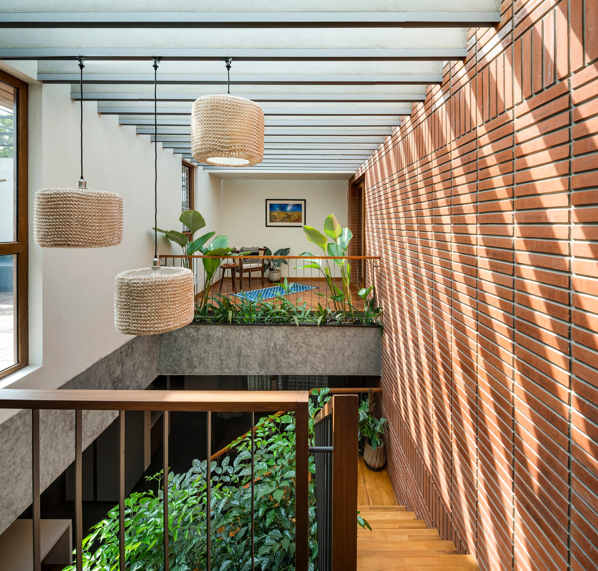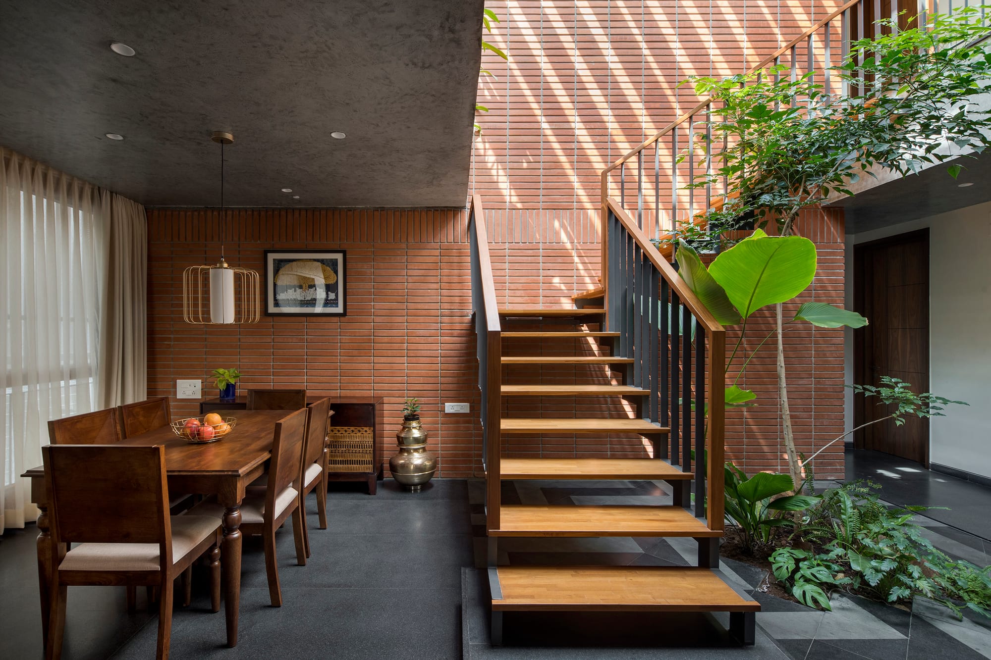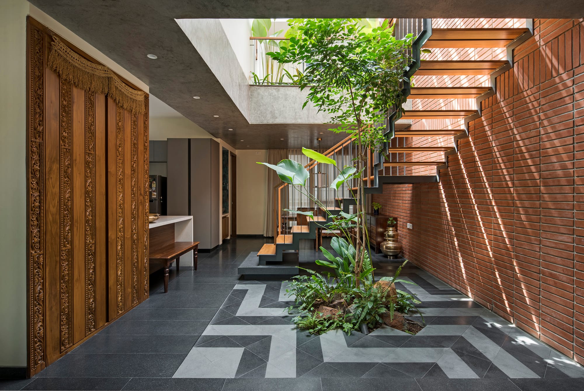 An unpretentious ruddy brick wall catches the light through an overhead concrete trellis, the wooden treads of a central staircase guide the gaze, a dynamic interplay of volumes unfolds, and the landscaping softens the material honesty. With warm laminate wood floors mingling with dual-toned granite, the palette becomes a tactile rhapsody.