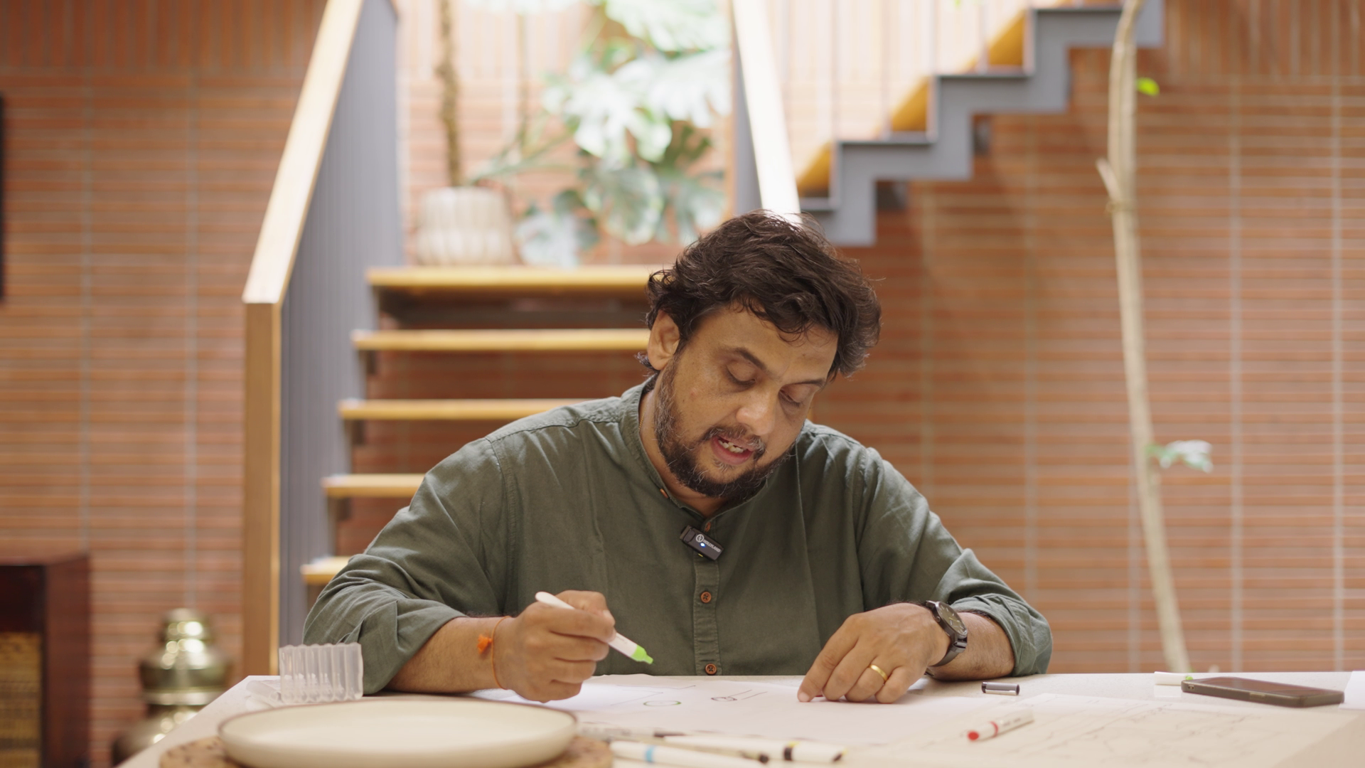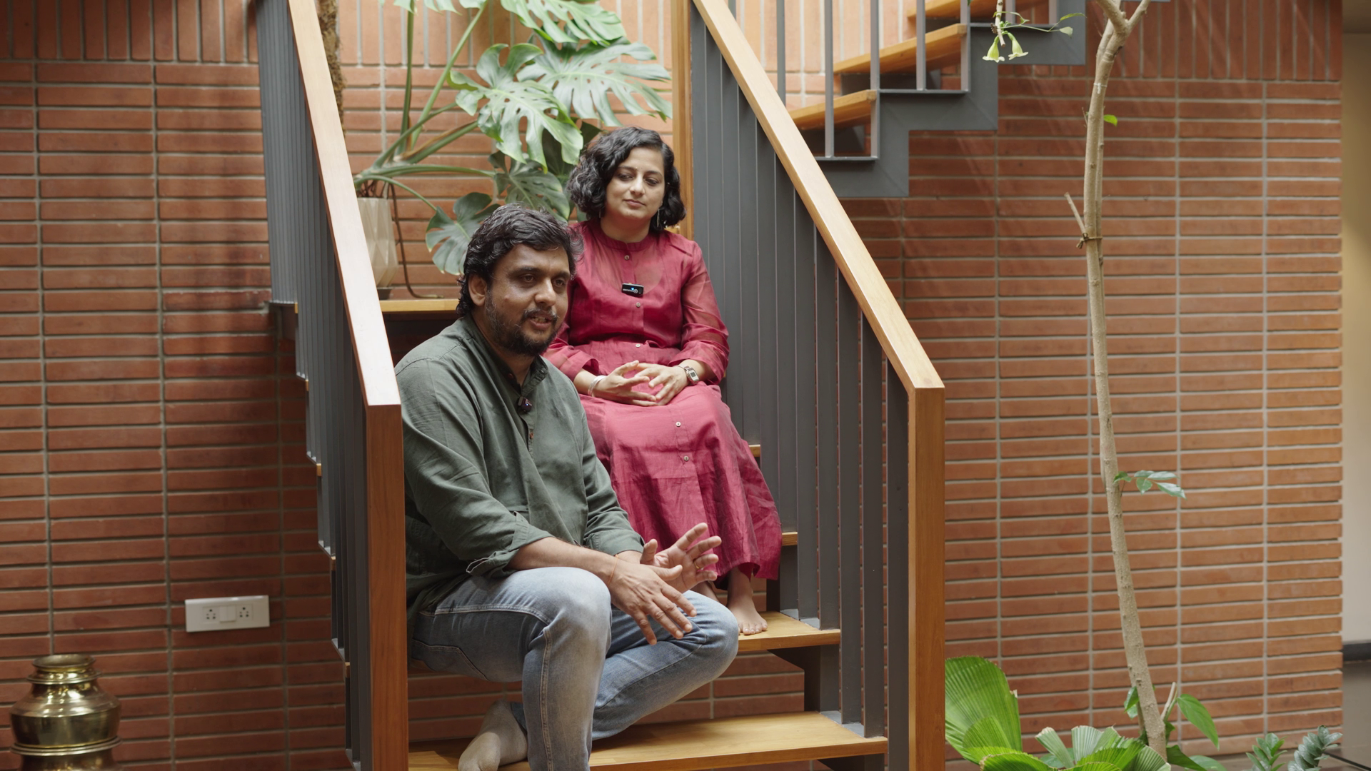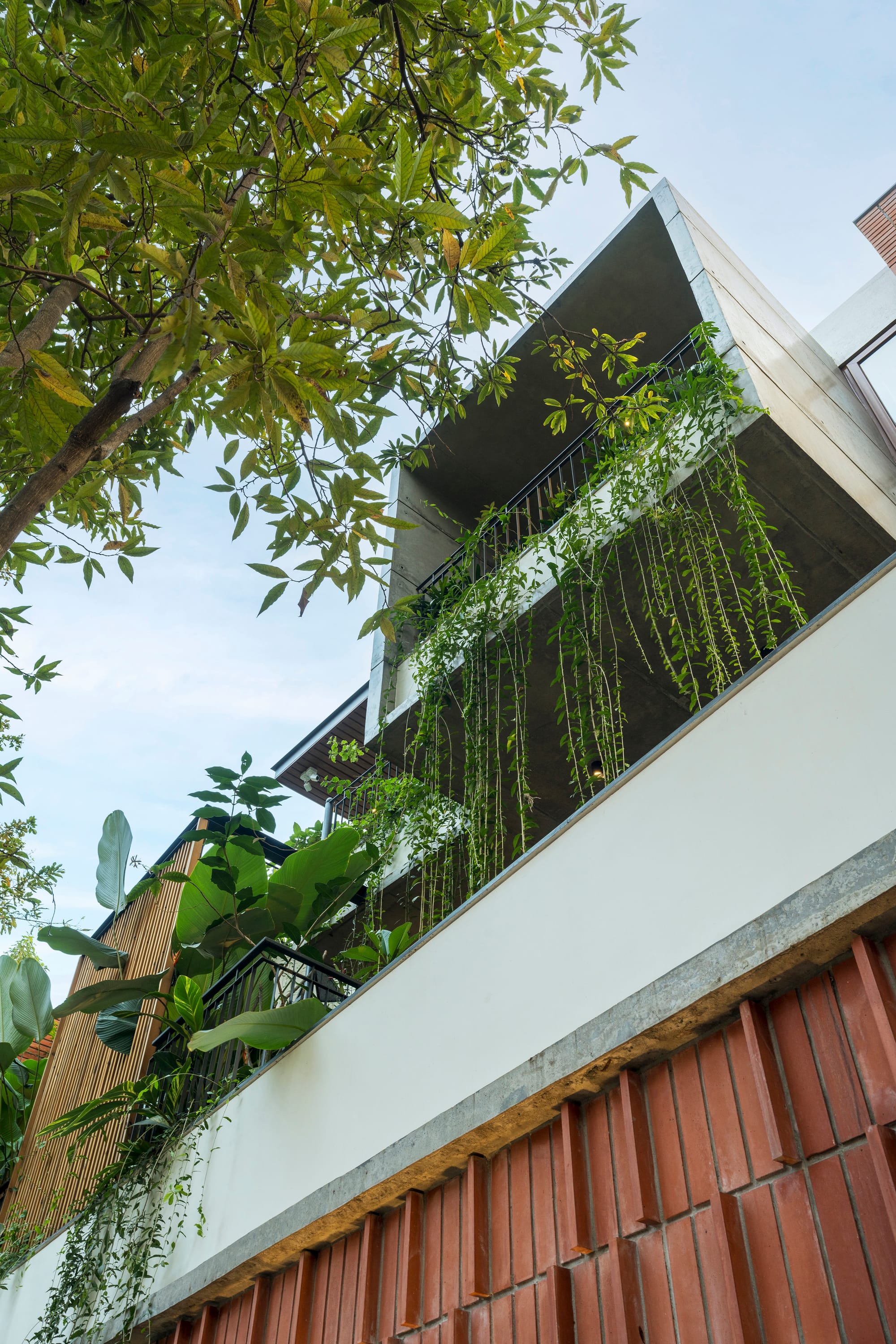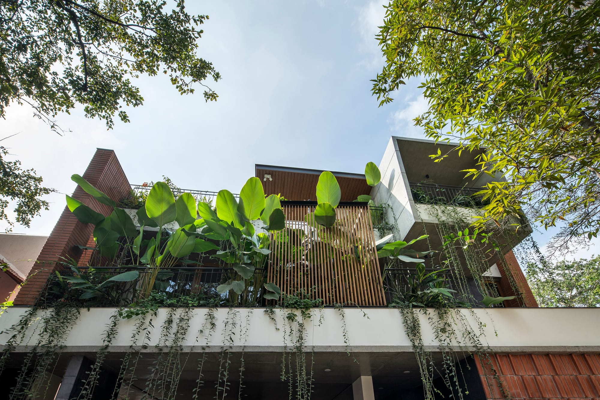 Like wind blowing through foliage felted with spores, sunlight drifts through the pergola-style skylight into the central bay, illuminating every dust mote, the sinuous spine of the staircase, and the twin decks that gaze at each other across levels. Since the client wanted a home office on the top floor, an iron-wrought staircase rises in a winding crescendo to the master bedroom and cantilevered study from the outside, while the remaining expanse transforms into a sprawling terrace. The most beautiful part: a pre-existing champaka tree was never cut down, instead it became the guiding axis around which the home’s northwest quadrant gently wraps itself.