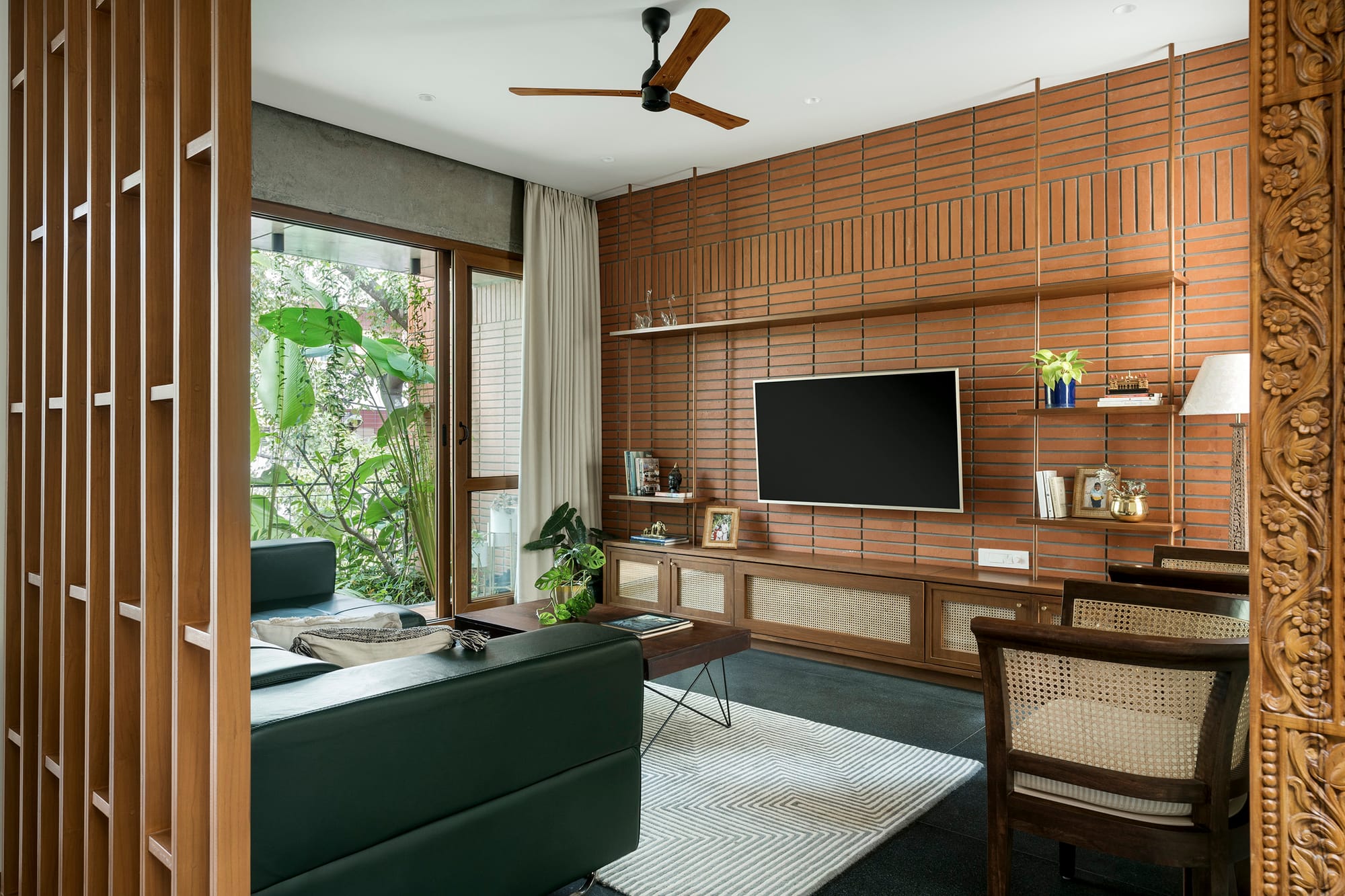 Leather-finish granite underfoot grounds the living room with a powdery, subdued sheen, while a jaali-inspired partition delicately separates it from the adjoining communal spaces. Crafted from thermo pine wood—robust, eco-friendly, and resistant to moisture—the louvres add both rhythm and warmth. Beyond, the integrated balcony forms a natural buffer, accessible through sliding doors. A jade-toned sectional invites laid-back lounging, its low-slung profile complemented by mid-century modern furniture with rattan detailing, balancing utility with understated elegance.
