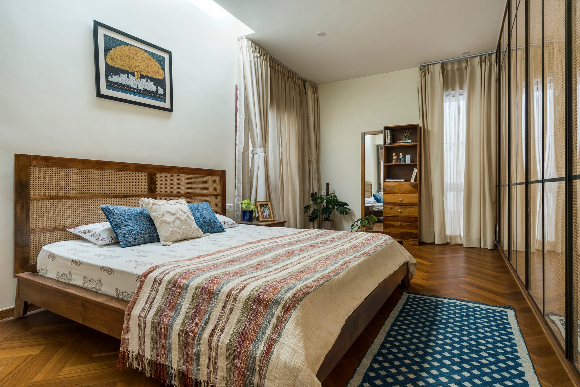 This Bengaluru home’s narrative takes on cosier undertones in the bedrooms. Warm laminate wood flooring sets the foundation, sheer curtains let light trickle in, and rattan returns in the headboards and between the glass doors of the wardrobes. In the master bedroom, one feels tucked away in a treehouse, yet the outdoor deck unfolds into the inner sunken courtyard—a paradox that remains beautifully unresolved.