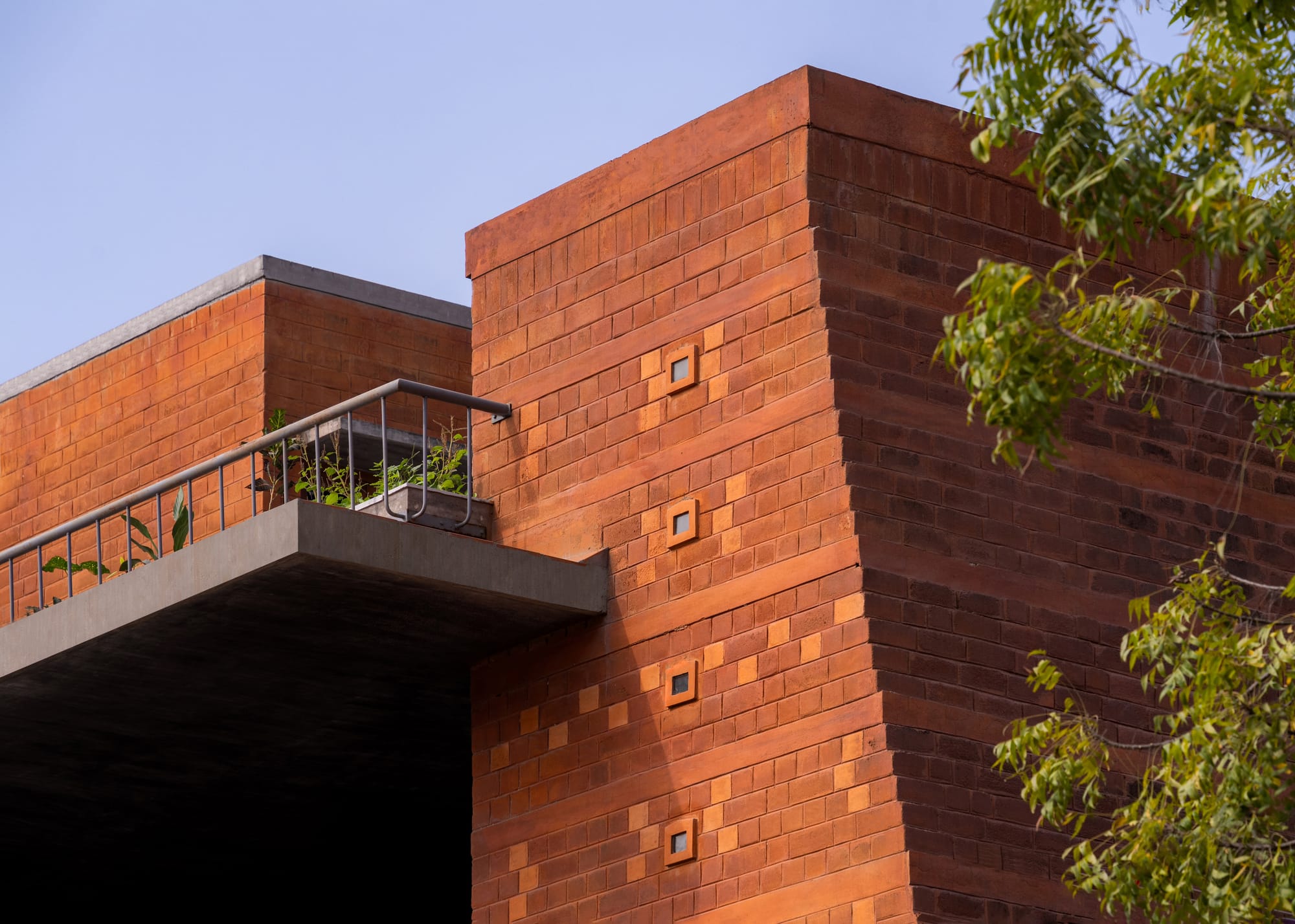 At L’in Brick House, exposed brick masonry forms both the structure’s spinal column and its most expressive archetype. Echoing the staccato vimanas of ancient Dravidian shrines, each wall is laid with care, using Compressed Stabilised Earth Blocks (CSEB) bound by mud mortar, baring textures, imperfections, and tonal variations that catch the eye like primordial runes embossed into the wall.