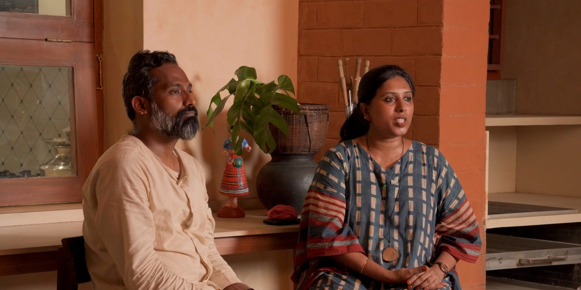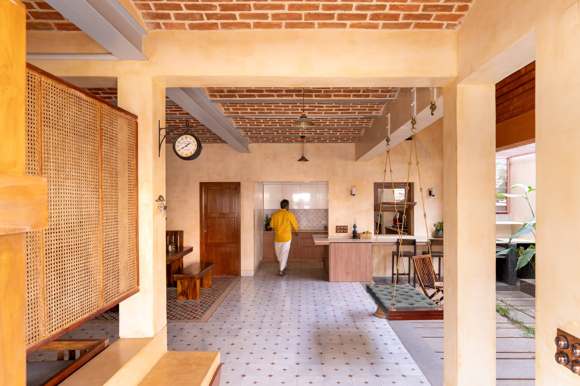 Ethereal rattan screens float effortlessly in the living room, offering a bohemian, tactile division without interrupting the open-plan flow. The adjacent kitchen is both functional and storied, with intimate wall niches and wooden shelving that speak to hand carved Thanjavur legacy. A four-seater teak-finish dining table with a picnic bench brings in a laid-back, communal rhythm. Suspended from iron chains, an heirloom oonjal, or customary South Indian swing, takes pride of place in the heart of this setting.