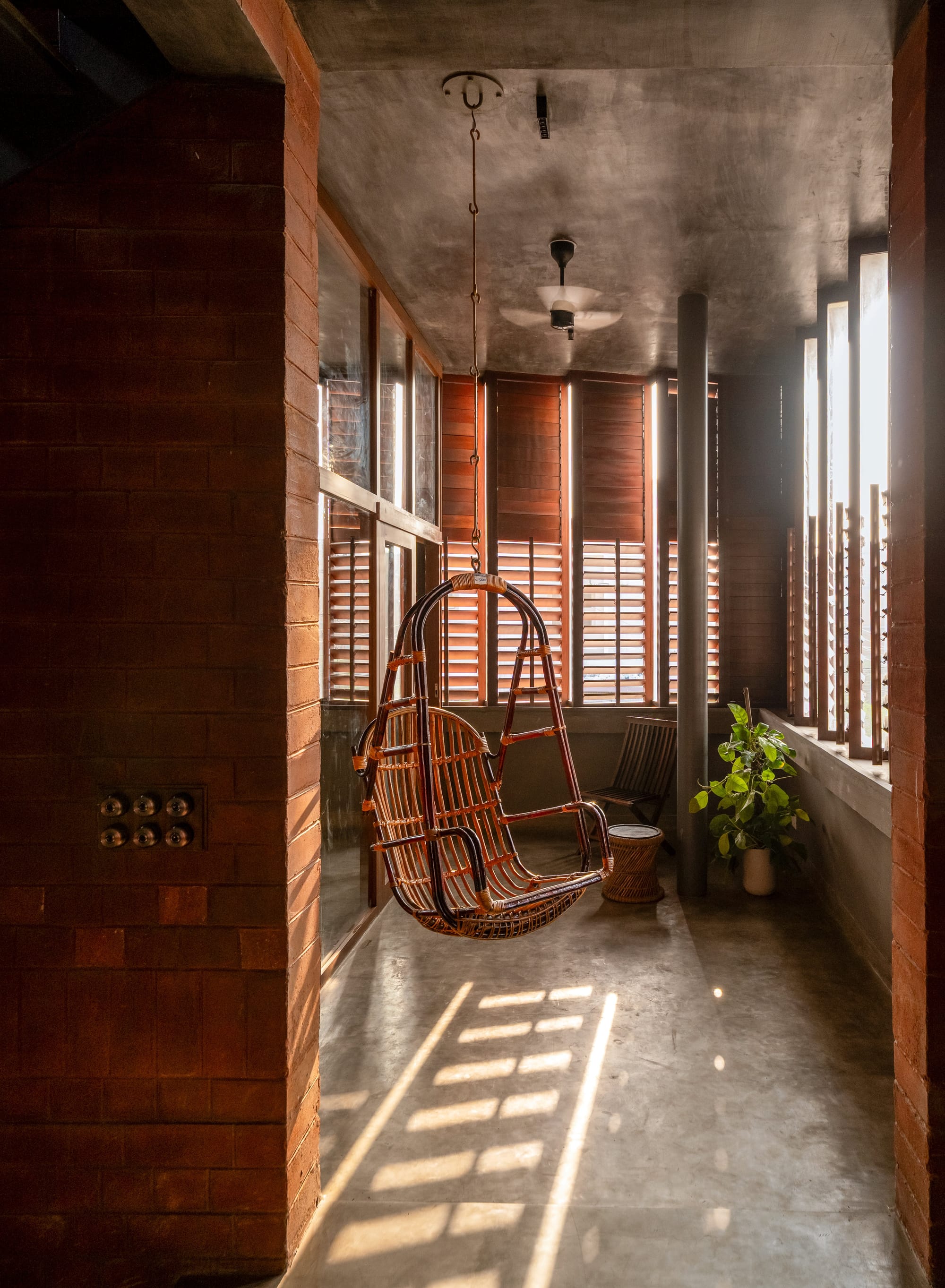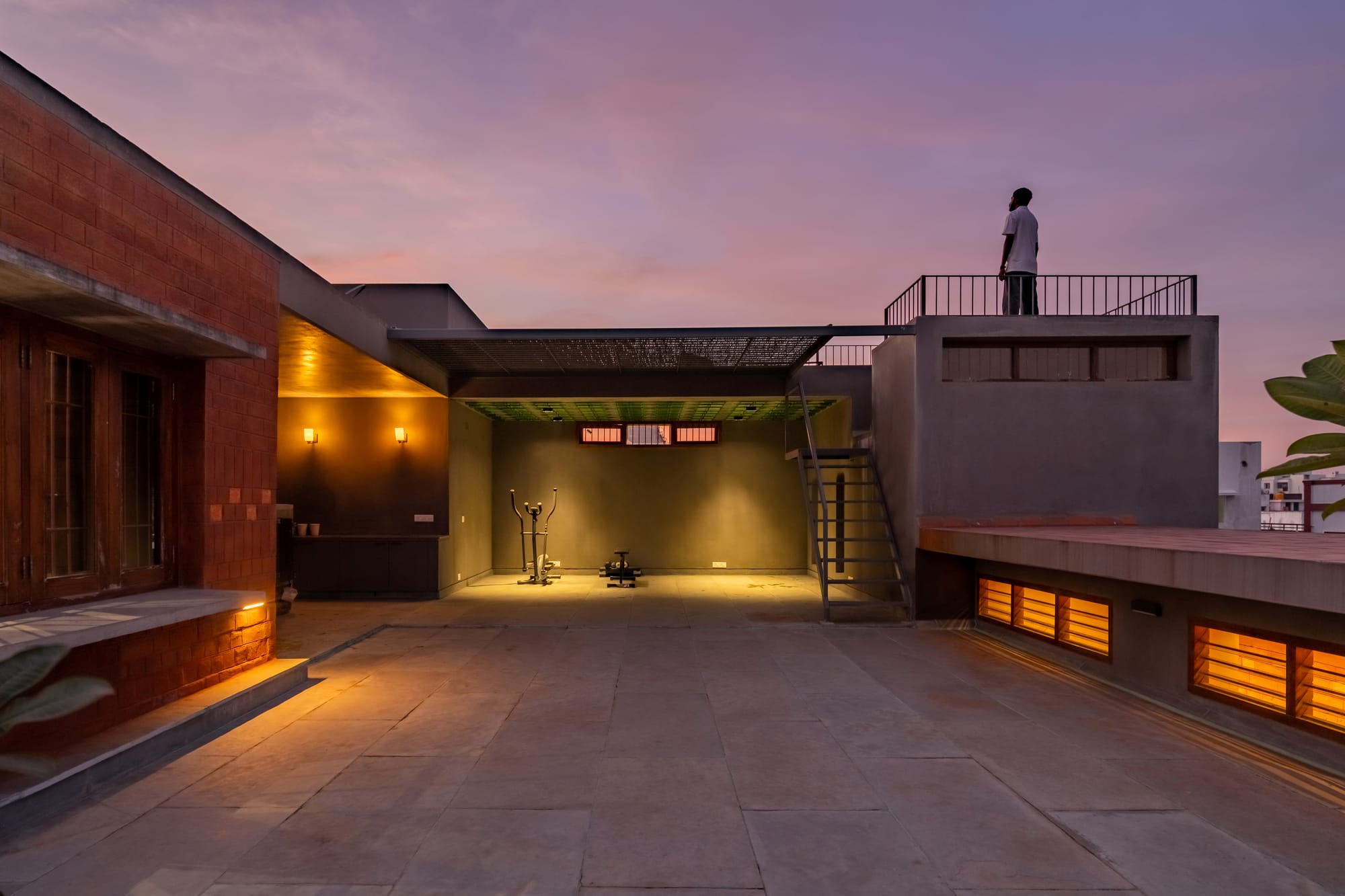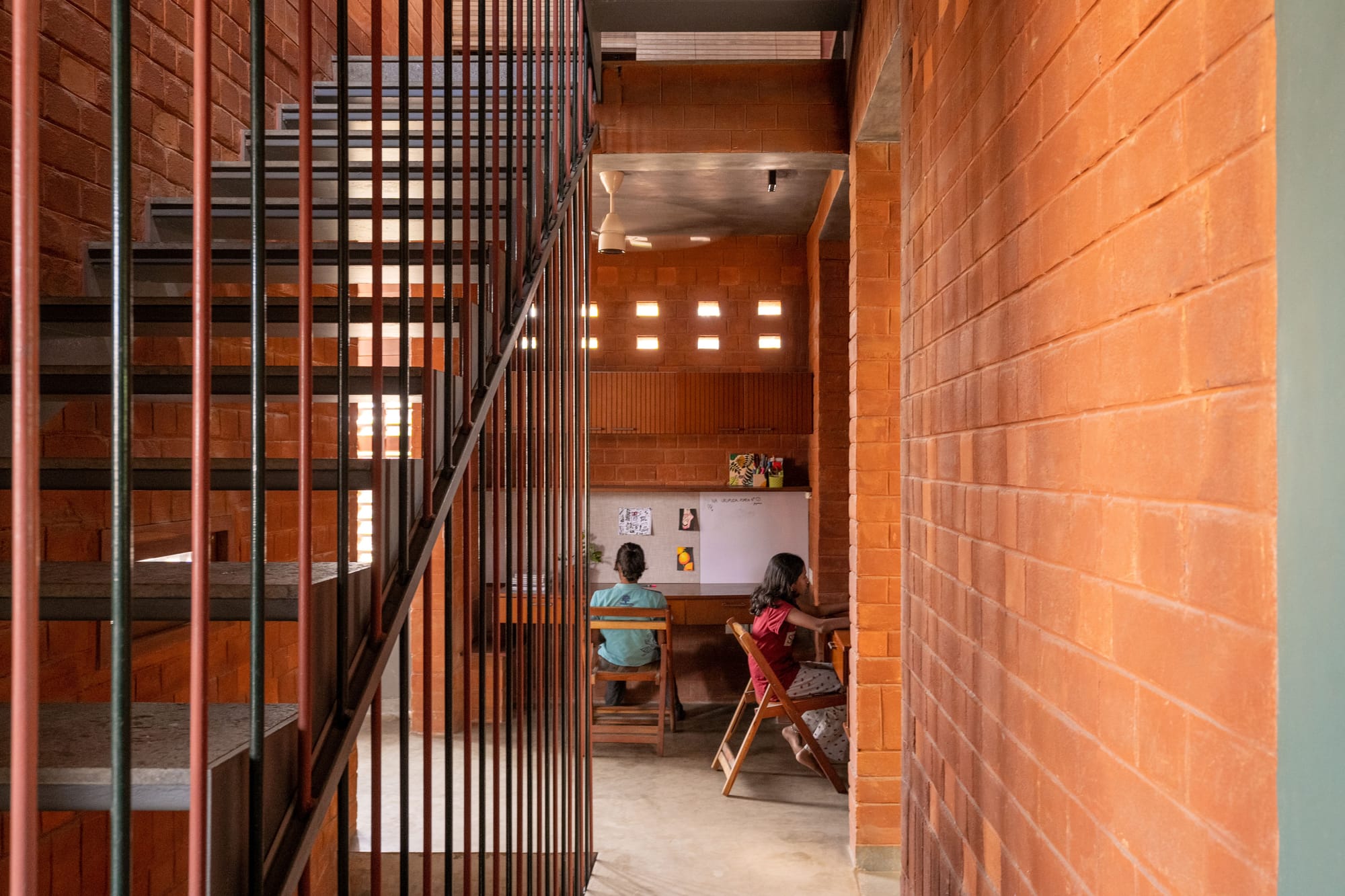 The roofscape, too, is an extrapolation of this grounded sensibility, coterminous with three distinct schemas. Brick jack arches undulate above the living areas, while the upper floors are sheltered by thick Madras terrace roofs, their layered density offering a cocoon-like insulation. In between, filler slabs span transitional zones and landings, their lightness tempering both material use and spatial weight. Together, these systems form a canopy that balances strength with subtlety.