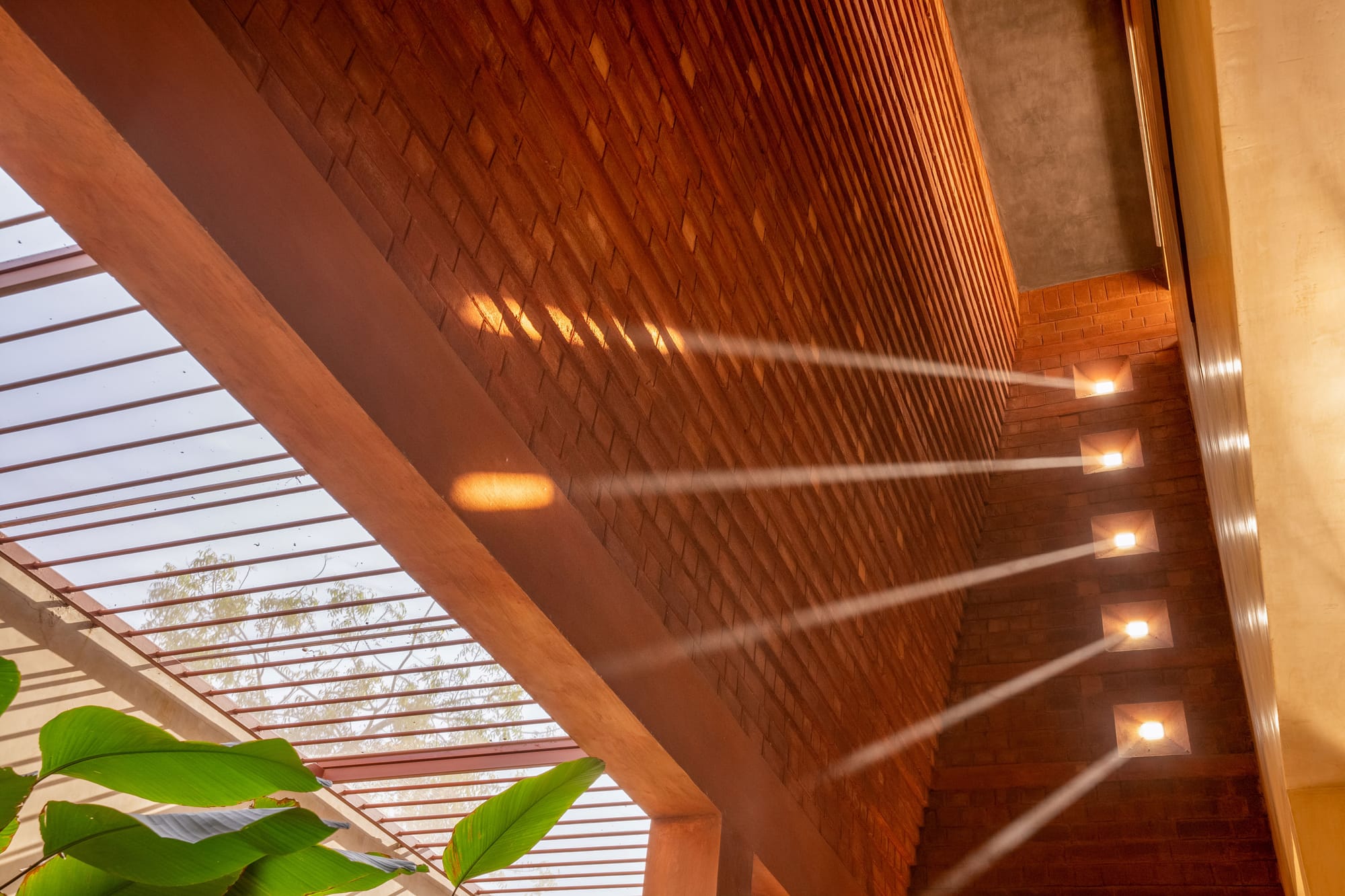 Keeping in mind the scorching, humid climate of coastal India, it became essential to anchor the home in passive design principles, site-sourced materials, and time-tested roofing techniques reinterpreted for contemporary living. On the ground level of L’in Brick House, a sequence of jack arches ripples across the ceiling like waves cast in rustic red. Their sinuous form gathers heat in gentle hollows and ridges, unobtrusively modulating the microclimate and supporting the home’s broader sustainability vision.