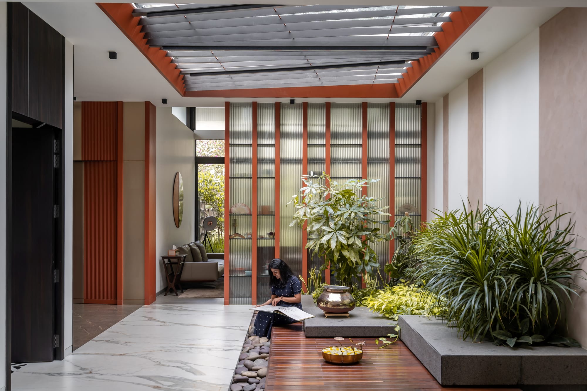 “This space acts as a transition and becomes the most connective part of the house,” explains senior architect Aishwarya Vaishnavi J, describing the foyer where an angled-fin pergola with a glass roof heightens the visual drama. A slatted wooden deck sits flush within a gravel island, ferrying visitors downstream and depositing them to the left into the formal living room. Polished marble floors and earth-toned furniture remain understated, while the layout unfolds like a porous edge, merging with the dry courtyard.