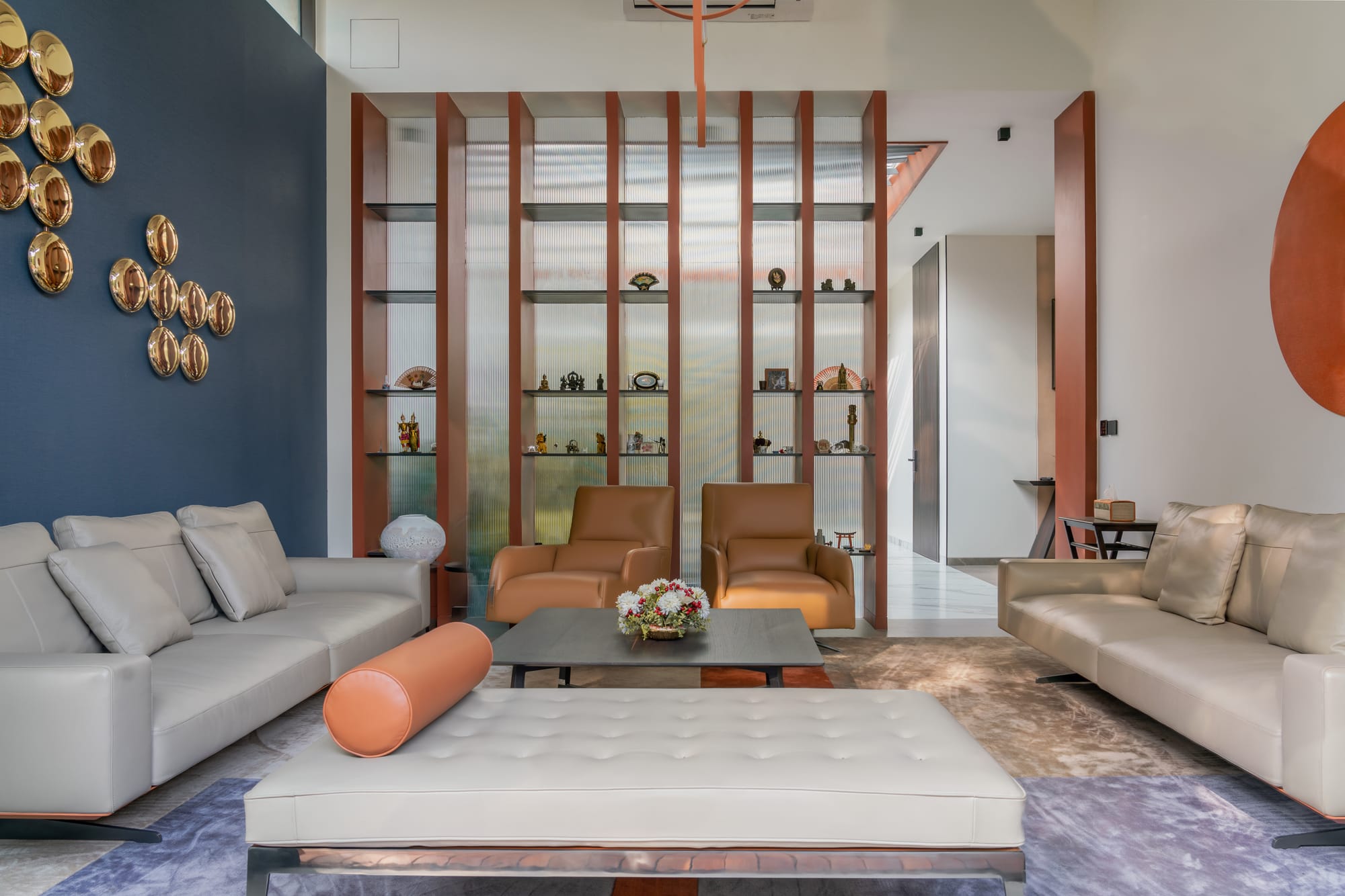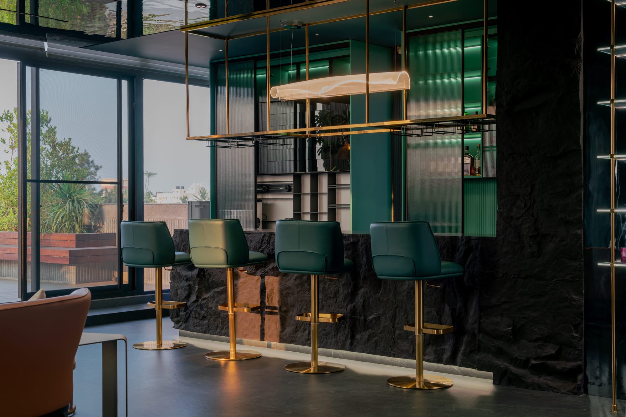 To give the house added levity and character, the designers carved out an exclusive, moody twilight zone for the homeowners on the second floor. Accessible via a dedicated lift, this recreation area exudes a refined savoir-faire, perfect for intimate soirées and family gatherings. The speakeasy-style bar features a dark, rock-textured counter base, elongated light fixtures, teal-coloured bar stools with metal accents, and fluted glass shelving. The second floor also unravels into a home theatre where carpeted floors, continuous fabric-clad walls, and plush recliners ooze grandeur, allowing each screening to feel like a premiere night.