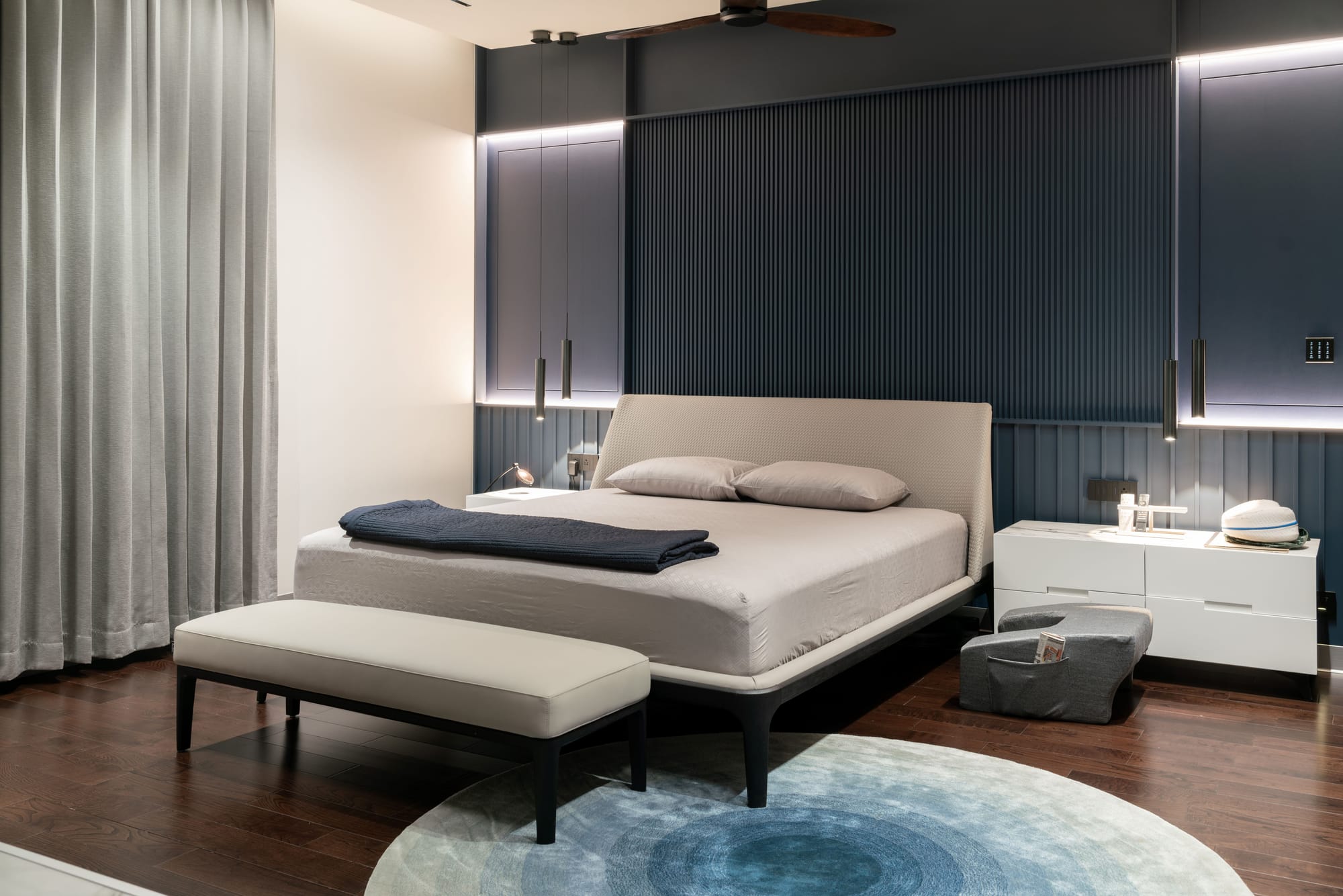 Beyond the sleek, intentionally pared-back kitchen, warmth and restrained luxury carry on into the home’s five spacious bedrooms. The master suites, a study in minimalistic elegance with a creamy palette, pops of blue, ribbed detailing, warm wood tones, and Nordic-style pendant lighting, are designed to resonate with the outdoors, letting the shifting moods of nature influence the home’s sleep-wake cycle.