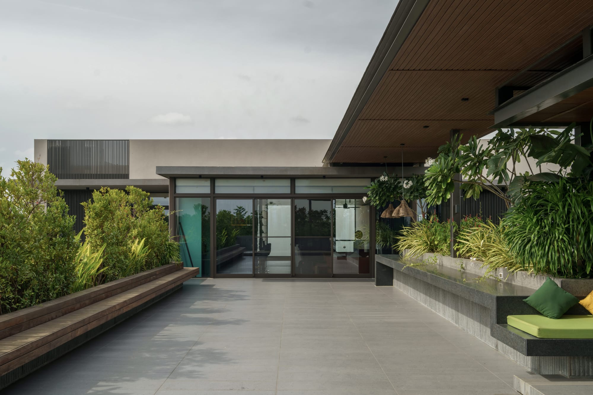 The terrace emerges as an extended arm of the entertainment lounge—a green, elevated landscape that mirrors the cascading vegetation veiling the house below. Plantings soften the concrete planes, while open decks and seating nooks invite lingering under the sky, letting indoor revelry spill gently into the calm of the outdoors.