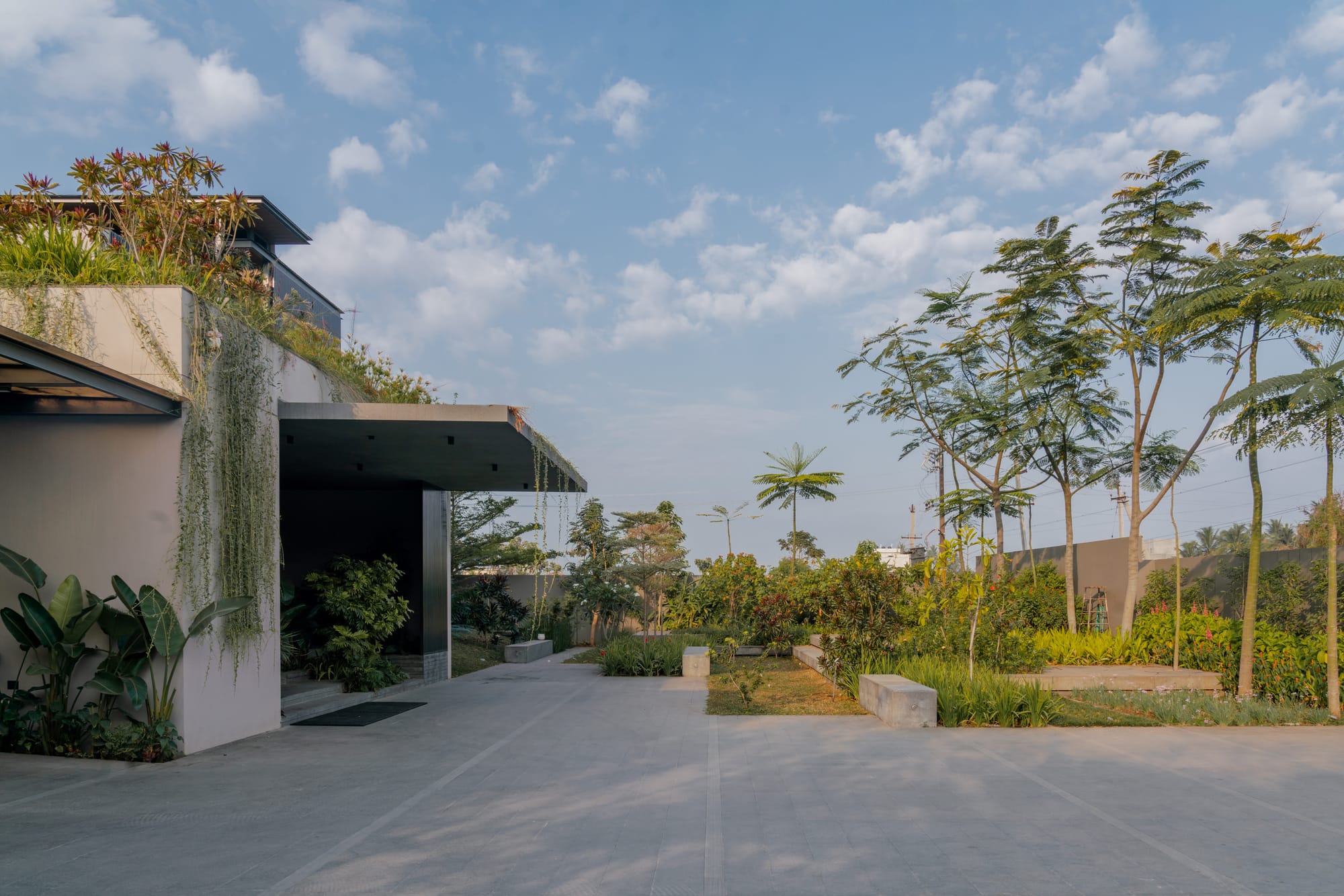 Since the spatial configuration leaned towards carving out a cocoon-esque retreat, roughly one quarter of the site was reserved as a natural buffer. A profusion of frangipani, crotons, and black olive trees formed a second skin that cloaks the residence. The staggered façade, with its interlocking concrete planes, cantilevered slabs, and open-to-sky courtyards on both the east and west, is draped in creepers, creating a site-responsive home where climate, Vastu, and landscaping act in unison.