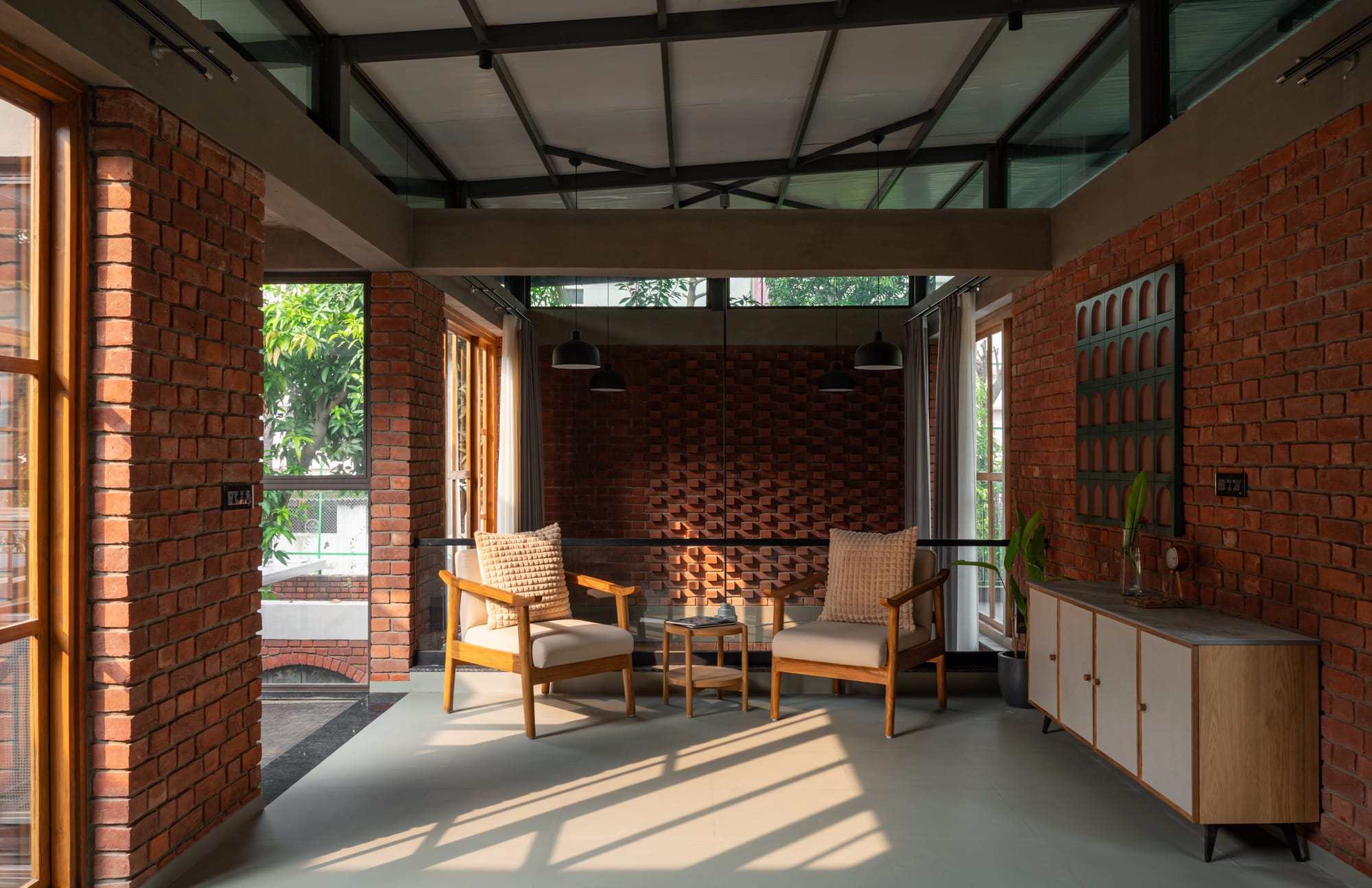 If one were to look at the prefabricated modular residences emerging across present-day Uttar Pradesh, the decision to return to a permeable baked-brick and exposed concrete structure might strike the layperson as slightly unusual. For Ar. Prakhar Ranjan of W5 Architects however, crafting a home is an intentional, immersive process that “allows the design to evolve organically with its surroundings.” This becomes ostensible in the 5,500 sq. ft. Gorakhpur Farmhouse right from the living room, where bare-brick walls, Kota stone flooring and wooden accents all contribute to an unpretentious, site-responsive tableau grounded in traditional masonry techniques.