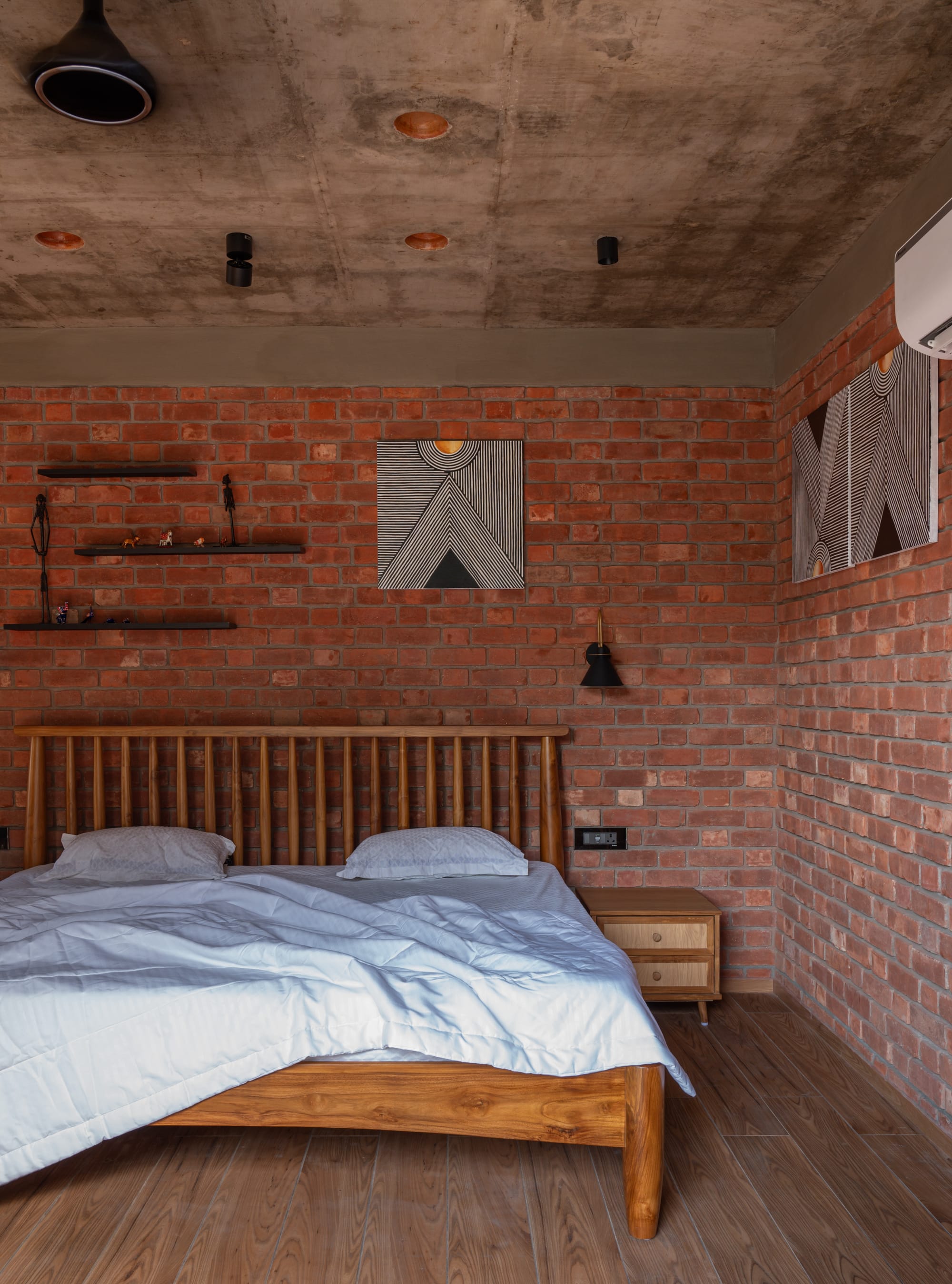 Most prominently, the artwork that adorns the walls is not mere ornamentation; it represents a second life for discarded wood scraps and construction debris, reincarnated so that nothing goes to waste. Architecture, after all, is not just about space; it is about people. “The farmhouse became a platform for local artisans,” Prakhar adds, “with women laborers engaged in fine masonry work, intricate brick pointing, and surface texturing.” This spirit of collaborative making is not confined to shared spaces alone, but actively extends into the home’s more private realms.