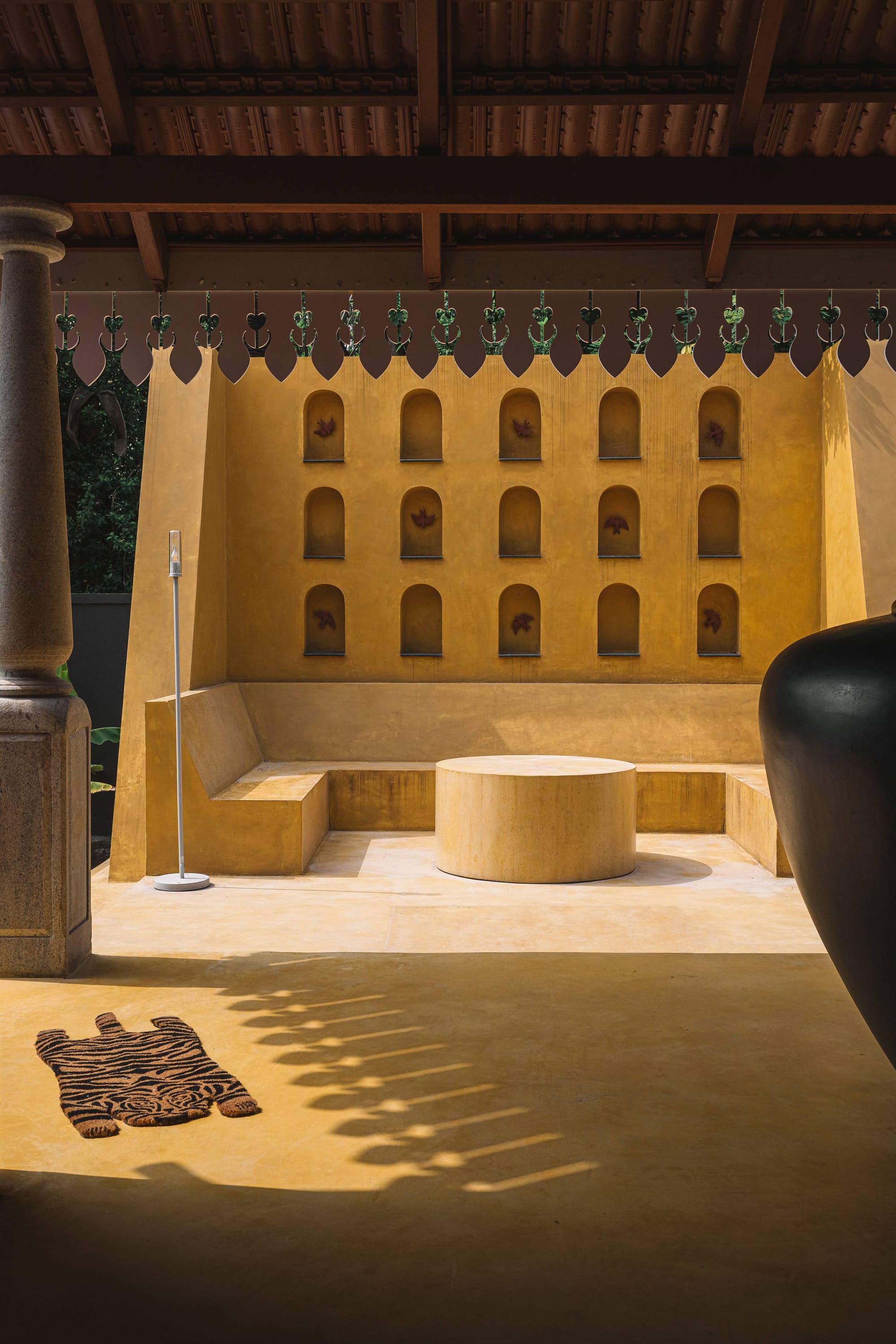 ‘Mallige’, as named after the jasmine flower, sparked from a faint, sensorial fragment of childhood: the vastness of a long-vanished Mangalore tile factory. Rohan remembers being completely enveloped beneath a double-height roof where terracotta tiles rested on an exposed lattice of wooden trusses. The air was thick with the scent of sun-baked clay and ash, and the space felt uninterrupted, raw, and completely free. This nostalgic spatial memory became the enduring seed for Mallige.