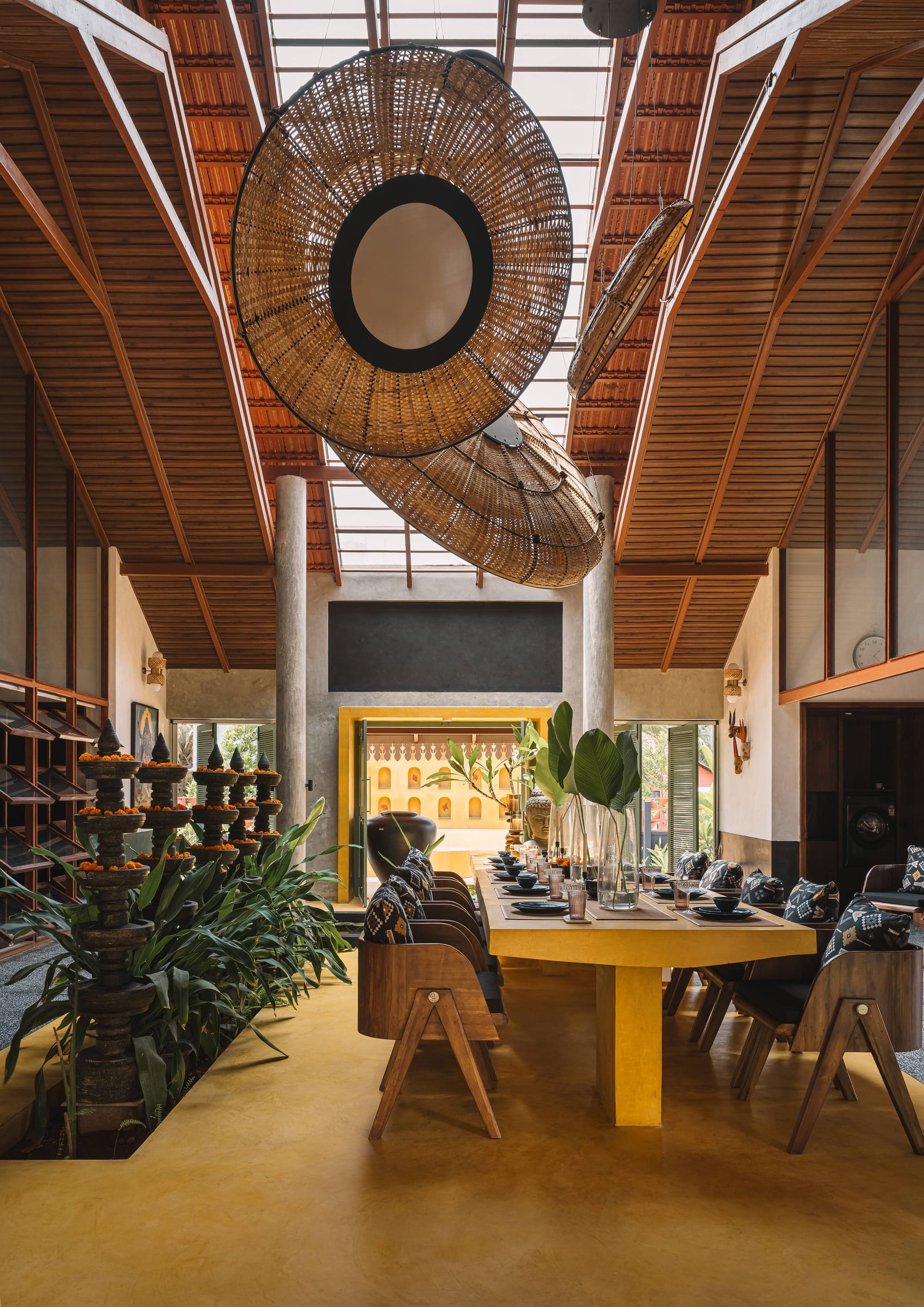 Over these colourful surfaces lie the subtle, coastal aesthetic touches that add layers of poetry. These visual details ground the home in its location: oversized bamboo pendant lights, designed in the form of abstracted lily pads, hover over the dining space. These lights are intentionally installed at varying angles to play with scale and dramatically enhance the height and volume of the space. Further, the house breathes effortlessly, its open planning and thoughtful orientation allowing for consistent cross ventilation. Above the unconventional dining courtyard, the roof is subtly raised to introduce a clerestory band of ventilators, a crucial element that allows hot air to escape passively, thereby maintaining thermal comfort. The roof structure itself—a high, sloping form lined with traditional Mangalore tiles —features metal trusses, painted with marine-graded paint to prevent corrosion.