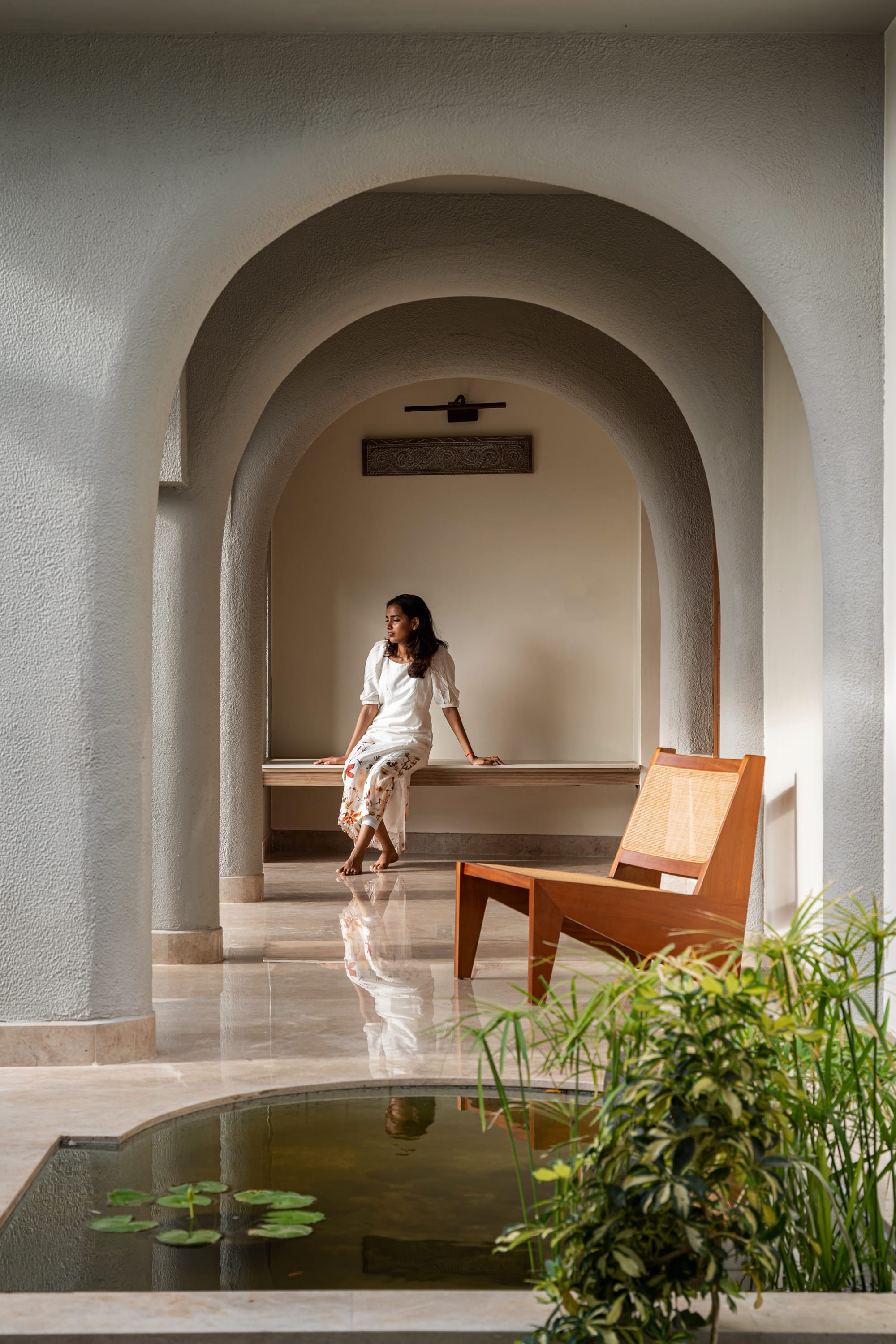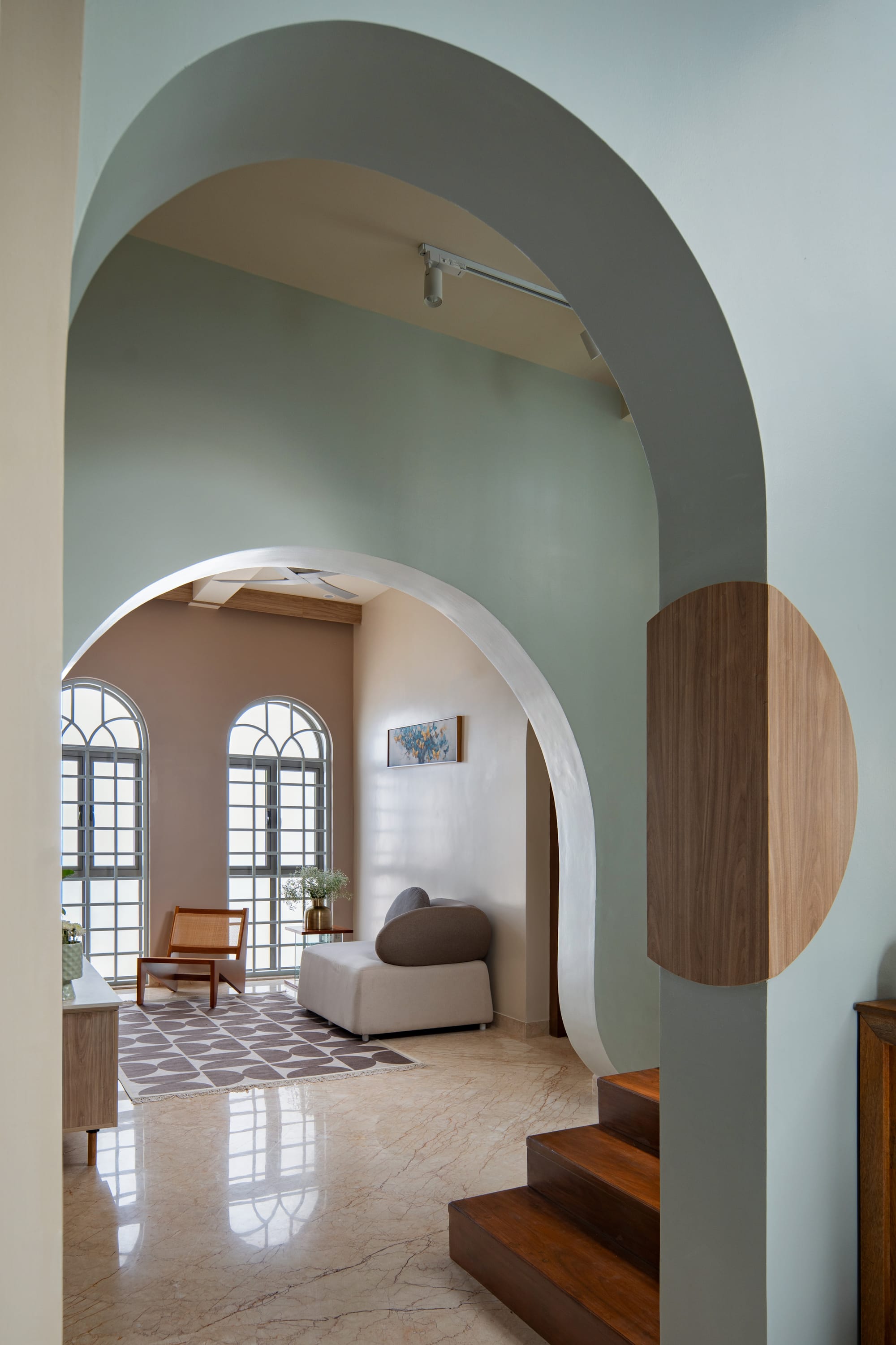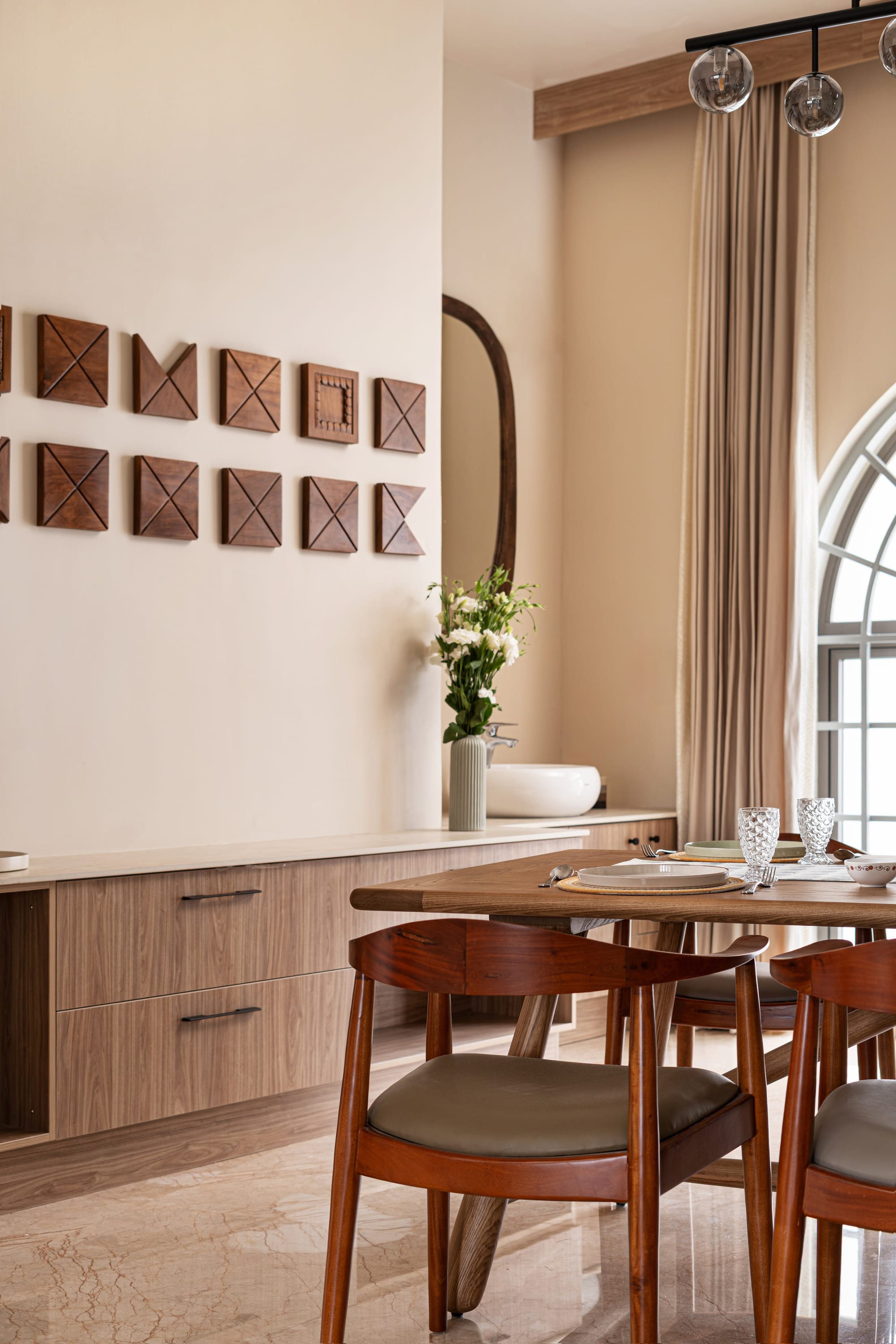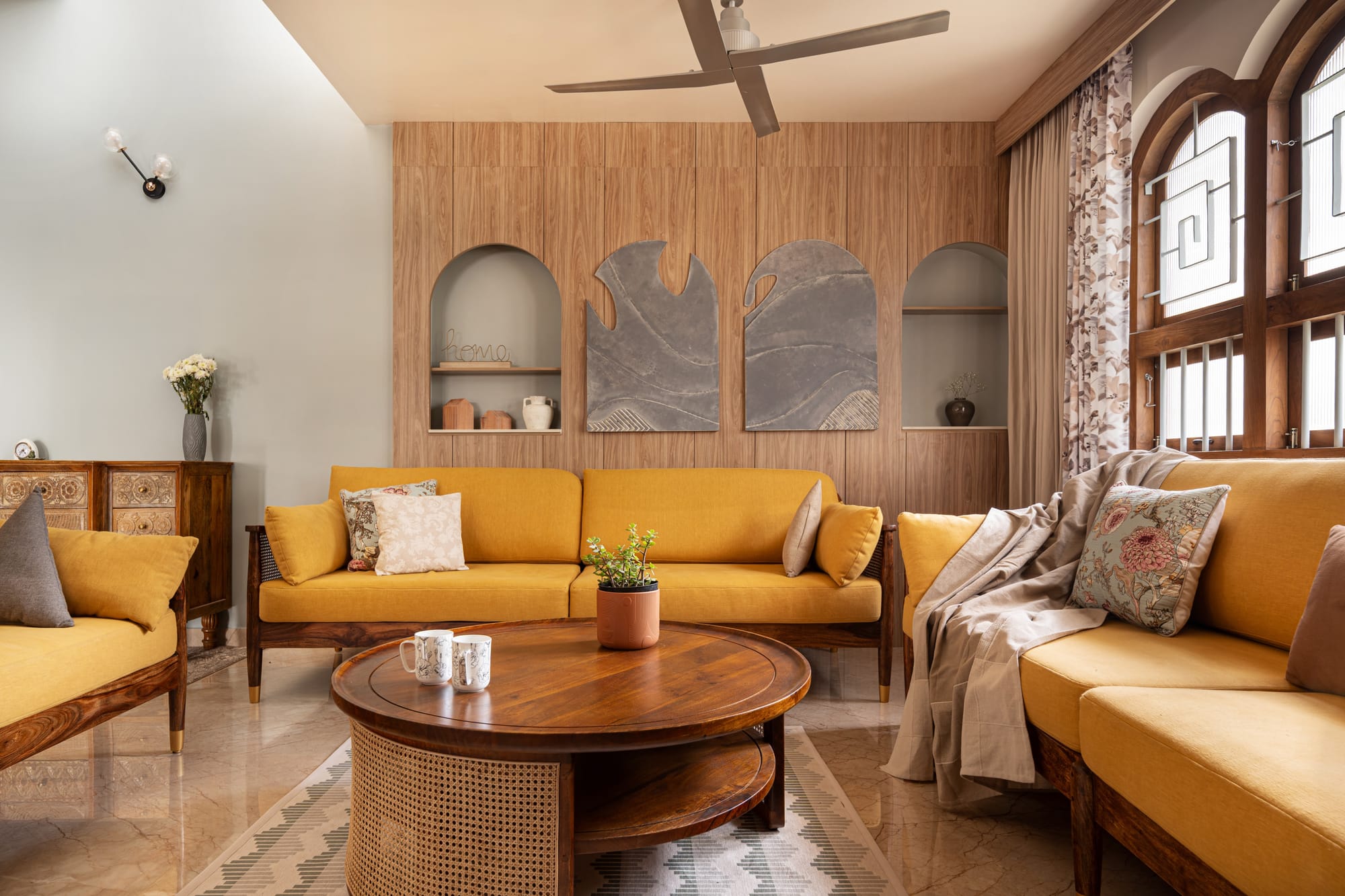 In the grounded, double-height living room, arched windows featuring Art Deco grilles flood the space with soft, diffused light through fluted glass; mustard-yellow sofas huddle around a round, solid wood coffee table with a coastal touch of rattan. Here, every edge curves and billows as if softened by the river of time, from recessed niches for trinkets and small ceramic vases to abstract, textured wall panels. Striking an equilibrium between rich Indian heritage and mid-century modern functionality, an ornately carved accent cabinet in a weathered honey finish adds just the indulgent spin the otherwise restrained décor needs.